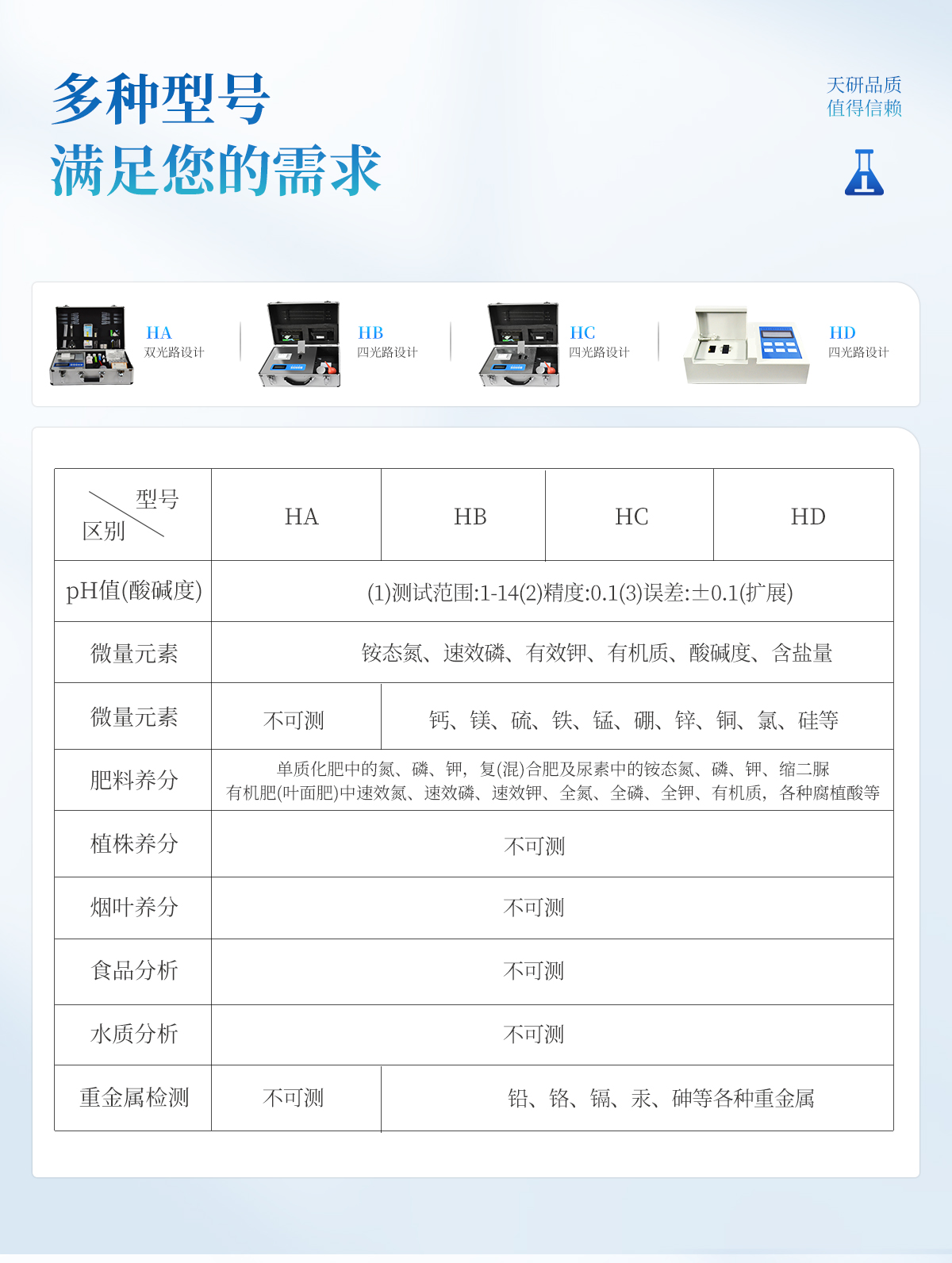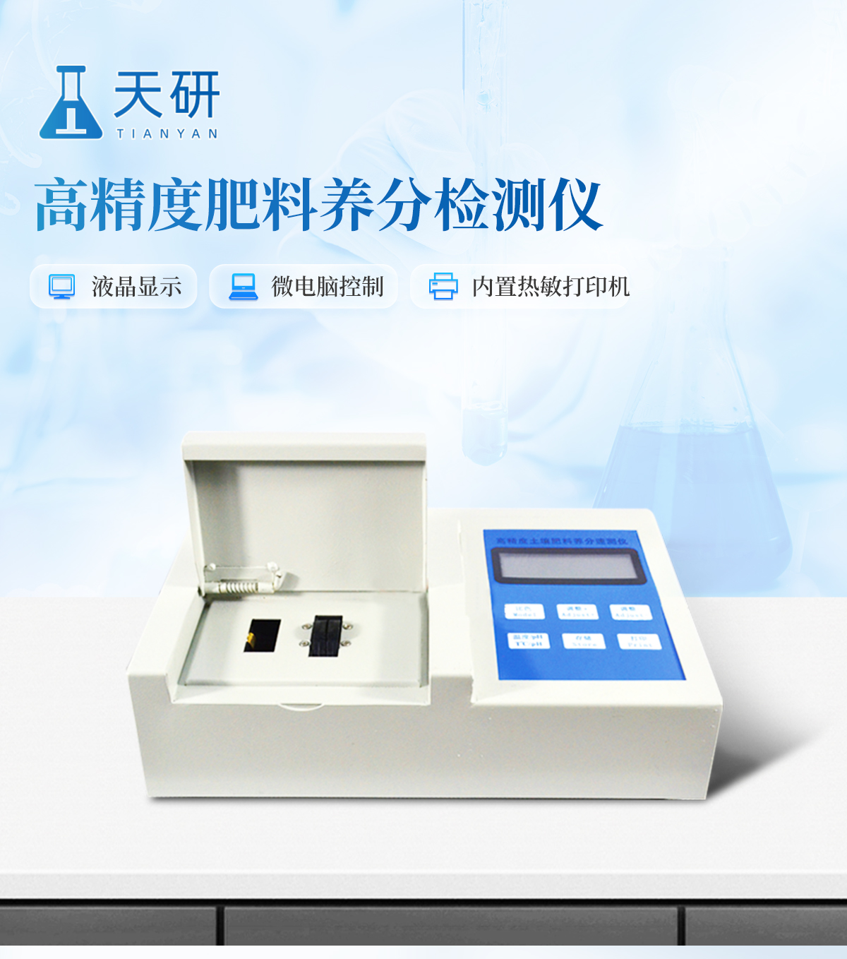 | 肥料養(yǎng)分:● 單質化肥中的氮、磷、鉀; ● 復(混)合肥及尿素中的銨態(tài)氮、硝態(tài)氮、磷、鉀、縮二脲; ● 有機肥(葉面肥)中速效氮、速效磷、速效鉀、全氮、全磷、全鉀、有機質,各種腐植酸等。可擴展檢測鈣、鎂、硫、鐵、錳、硼、鋅、銅、氯、硅等微量元素以及各種重金屬(鉛鉻鎘汞砷)。 |