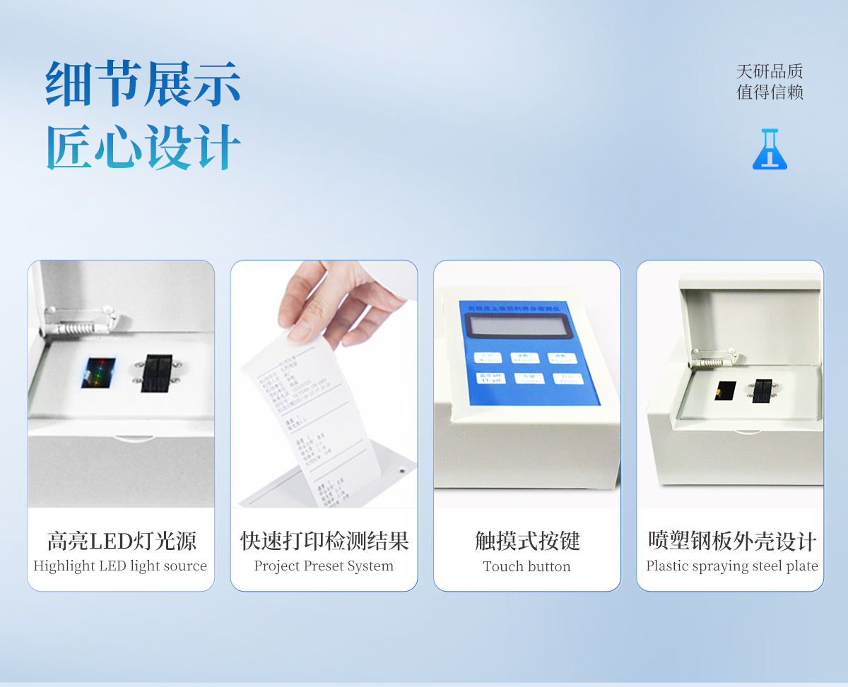 | 升級款,噴塑鋼板外殼設計,堅固耐用,配套成套附件及成品藥劑。 | 微電腦控制,數字化線路、程序化設計,液晶顯示,交直流兩用,可野外流動測試。 | 分辨率:0.001,觸摸式按鍵,內置新一代熱敏打印機,可打印測試結果。 | 肥料養(yǎng)分專用檢測儀可檢測化肥、有機肥(含葉面肥、水溶肥、噴施肥等)中的速效氮、速效磷、有效鉀、全氮、全磷、全鉀、有機質、酸堿度,鈣、鎂、硫、鐵、錳、硼、鋅、銅、氯、硅等各種中微量元素以及鉛、鉻、鎘、汞、砷等各種重金屬含量。 | 采用高亮LED燈光源、雙撥輪濾光式處理技術,保證光源波長穩(wěn)定, 硅半導體作為信號接收系統,壽命長達10萬小時級別。光源穩(wěn)定,重現性好,準確度高。 | 比色槽部分采用單通道設計,無機械位移及磨損,光路測試定位**,保證測定結果精度。 | 采用自主分析方法(號:ZL 2018 2 1777724.7),保證檢測結果絕對達到國標要求。 | 內置熱敏打印機,肥料打印結果為百分含量,測試誤差小于0.5%。 |