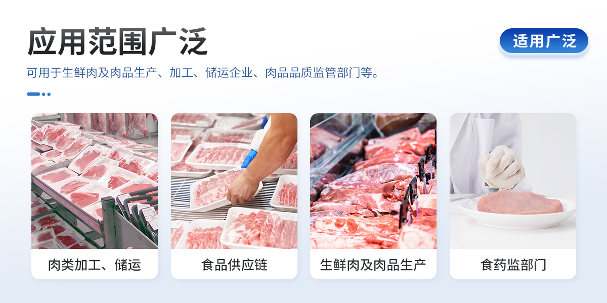 可用于檢測生鮮肉的蛋白質(zhì)、脂肪、水分、pH、TVC、TVB-N、新鮮度、L*、A*、B*等品質(zhì)參數(shù)。配備手提箱式防水減震外殼、大尺寸觸控屏幕并內(nèi)置大容量電池,可一鍵自動校準(zhǔn),是一款適合移動作業(yè)場景的高精度生鮮肉品質(zhì)檢測儀,其可用于生鮮肉及肉品生產(chǎn)、加工、儲運企業(yè)、肉品品質(zhì)監(jiān)管部門等。