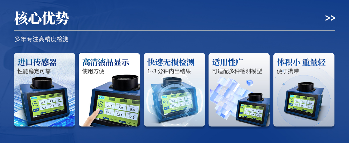 | ◆ 進口核心檢測傳感器,性能穩(wěn)定可靠; | ◆ 快速無損檢測,1~3 分鐘內(nèi)出結(jié)果; | ◆ 10 吋觸屏操作簡單,使用方便; | ◆ 適用性廣,可適配多種檢測模型; | ◆ 支持客戶自建模型; | ◆ 體積小、重量輕,便于攜帶; |