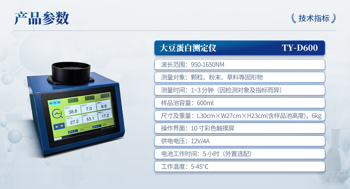 | 波長范圍:950-1650nm | 測量對象:顆粒、粉末、草料等固形物 | 測量時間:1~3 分鐘(因檢測對象及指標而異) | 樣品池容量:600ml | 尺寸及重量:L30cm×W27cm×H23cm(含樣品池高度),6kg | 操作界面:10 寸彩色觸摸屏 | 供電電壓:12V/4A | 電池工作時間:5 小時(外置選配) | 工作溫度:5-45℃ |