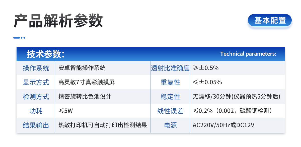 | 1.電源:交流 220±22V 直流 12V+5V(儀器內(nèi)置鋰電池也可用車載電源) | 2.功率: ≤5W | 3.量程及分辨率:0.001-9999 | 4.重復(fù)性誤差: ≤0.02%(0.0002,重鉻酸鉀溶液) | 5.儀器穩(wěn)定性:一個(gè)小時(shí)內(nèi)顯示數(shù)字無(wú)漂移(透光度測(cè)量);兩個(gè)小時(shí)內(nèi)數(shù)字漂移不超過(guò)0.3%(0.003,透光度測(cè)量)、0.001(吸光度測(cè)量)。 | 6.線性誤差: ≤0.1%(0.001,硫酸銅檢測(cè)) | 7.靈敏度:紅光≥4.5 ×10-5 藍(lán)光≥3.17×10-3 綠光≥2.35×10-3 橙光≥2.13×10-3 | 8.波長(zhǎng)范圍 :紅光:680±2nm; 藍(lán)光:420±2nm; 綠光:510±2nm;橙光:590±4nm | 9.顯示屏分辨率:1024*600 | 10.抗震等級(jí):IP65 | 11、儀器尺寸:48×34.5×22cm | 12、主機(jī)凈重:5.2kg |