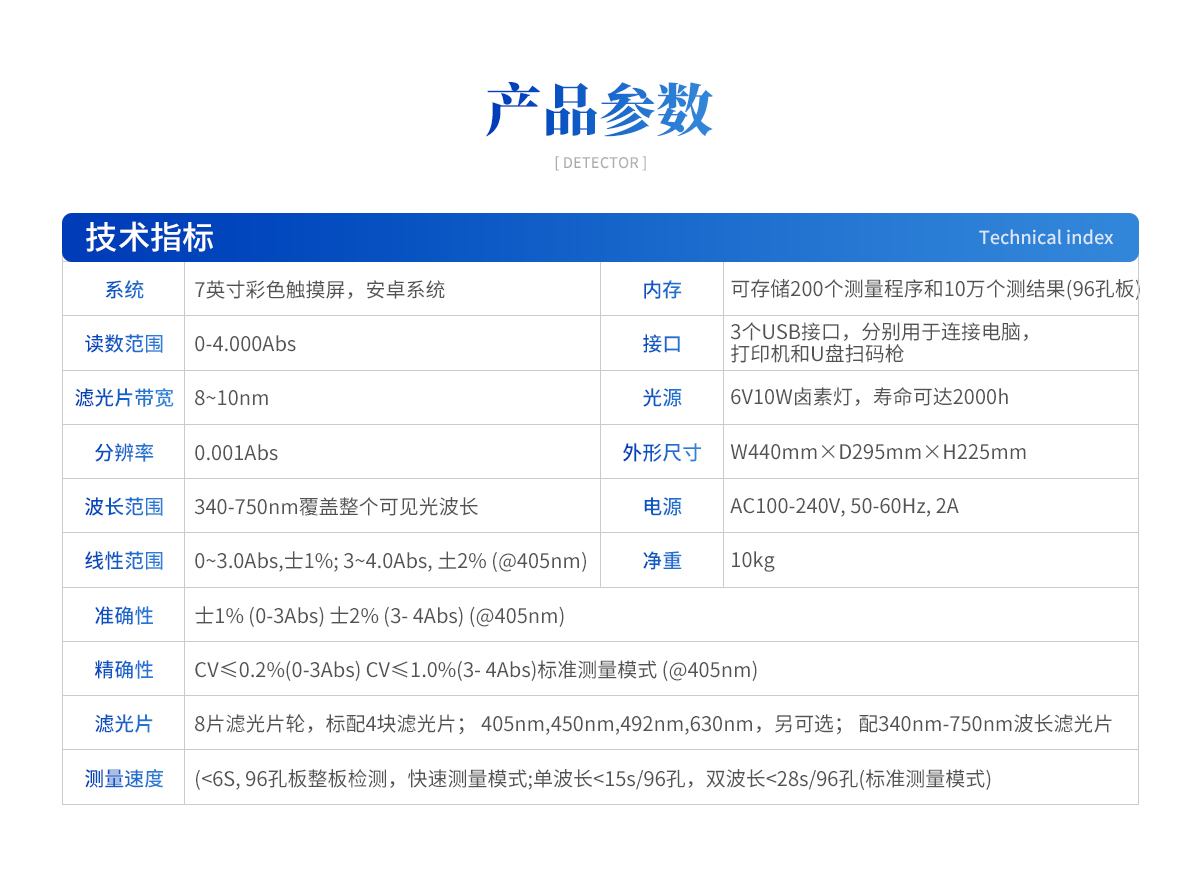 | 1. 高清觸摸屏: 顯示使用7英寸彩色觸摸屏,分辨率為1280*800像素。 | 2.內(nèi)置軟件: 內(nèi)置軟件可提供儀器的控制和數(shù)據(jù)分析,可直接外接U盤。 | 3. 光源壽命長: 光源采用6V10W鹵素?zé)?,壽命可達2000h。 | 4. 讀板快速: 采用單波長,雙波長檢測讀板快速。 | 5. 振板功能: 根據(jù)使用配置了振板功能,可根據(jù)使用設(shè)置振板時間和速度。 | 6. 操作系統(tǒng): 配備自主研發(fā)的安卓操作系統(tǒng)可單機獨立使用,同時配置多種數(shù)據(jù) 輸出接口,方便不同的數(shù) 據(jù)傳輸和處理。 | 7. 可視化布板: 并采用可視化布板方式輸出測試結(jié)果。 | 8. 設(shè)置吸光度范圍:0~4.000Abs,滿足不同測量要求,并配備了8組濾光片輪,標配4組濾光片,根據(jù)使用 可選配340 nm~750nm波長的濾光片組合使用。設(shè)計合理無需打 開機蓋就可更換光源和濾光片。 | 9.檢測數(shù)據(jù):使用自動校準、定位系統(tǒng)算法使檢測數(shù)據(jù)更精準、可靠。 | 10. 配置對光路: 配置對光路,機械運動等進行自檢和診斷校對功能。 |