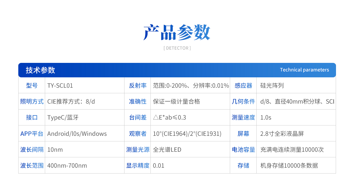 TY-SCL01色差儀全新升級(jí)款!采用Type C充電接口,內(nèi)置鋰電池充電,測(cè)量按鍵長(zhǎng)按開機(jī)測(cè)量,采用黑白手動(dòng)校準(zhǔn)技術(shù),保證每一次測(cè)量的顏色數(shù)據(jù)一致性穩(wěn)過(guò)計(jì)量。
