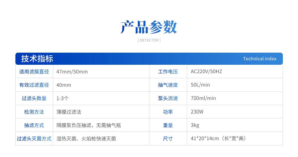 | 1、適用濾膜直徑:47mm/50mm 2、有效過(guò)濾直徑:40mm 3、過(guò)濾頭數(shù)量:1-3個(gè); 4、檢測(cè)方法:薄膜過(guò)濾法 5、抽濾方式:隔膜泵負(fù)壓抽濾,無(wú)需抽氣瓶 6、過(guò)濾頭滅菌方式:濕熱滅菌、火焰槍快速滅菌 7、尺寸:41*20*14cm(長(zhǎng)*寬*高) 8、重量:3kg 9、功率:230W 10、工作電壓:AC220V/50HZ 11、噪音小于30dB 12、物理按鈕開(kāi)關(guān) 13、可選擇單頭、三頭結(jié)構(gòu),選型豐富 14、抽氣速度:50L/min 15、泵頭流速:700ml/min |