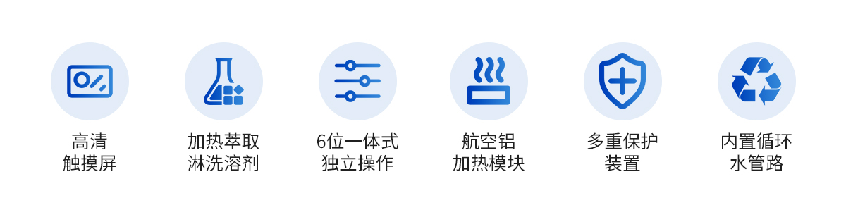 | 1.7英寸大液晶觸摸屏顯示控制,可升級程序控溫和遠(yuǎn)程操作系統(tǒng) | 2.6位一體式金屬浴加熱系統(tǒng),保證每只樣品可獨(dú)立操作 | 3.航空鋁加熱模塊,升溫速度快,回流速度快,大大縮短提取時間 | 4.進(jìn)口溫度傳感器,控溫精度高,均勻性好 | 5.自帶加熱萃取、淋洗溶劑回收功能,大大節(jié)約實(shí)驗(yàn)耗材 | 6.內(nèi)置循環(huán)水管路,操作簡單方便(可升級為內(nèi)置冷卻裝置) | 7.具有過壓,過熱,漏電多重保護(hù)裝置,無需看管,保證機(jī)器長時間使用的安全性 | 8.可升級成內(nèi)置冷水系統(tǒng),無需外接水源。具有計(jì)時和時間控制的循環(huán)系統(tǒng);冷卻水全自動控制。 |