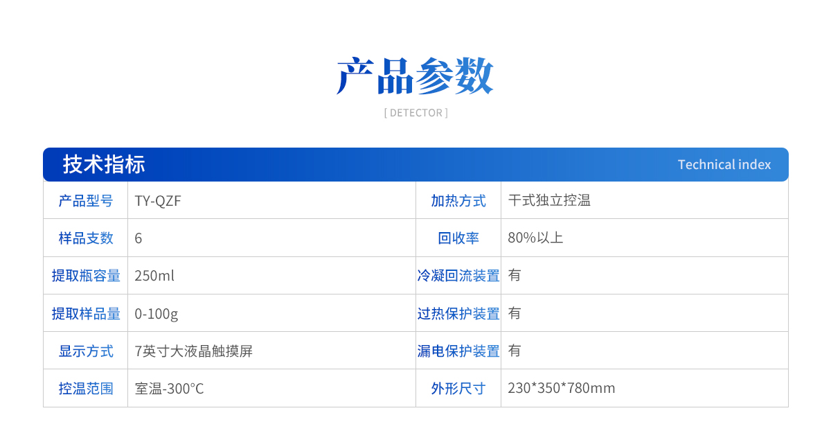 | 產(chǎn)品型號:TY-QZF 樣品支數(shù):6 提取瓶容量:250ml 提取樣品量:0-100g 顯示方式:7英寸大液晶觸摸屏 控溫范圍:室溫-300°C 加熱方式:干式獨(dú)立控溫 回收率:80%以上 冷凝回流裝置:有 過熱保護(hù)裝置:有 漏電保護(hù)裝置:有 外形尺寸mm:230*350*780 |