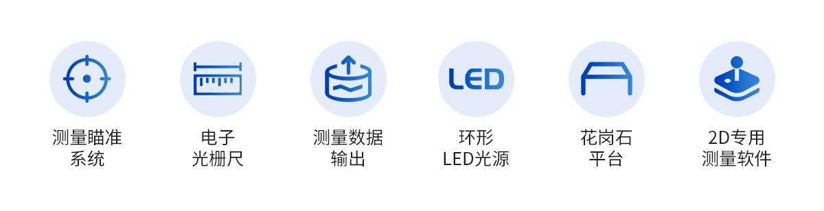 | 儀器基座 | CCD | 鏡頭 | 光柵尺 | 導(dǎo)軌 | 傳動 | 表面光源 | 底光源 | 數(shù)據(jù)采集卡 | 影像測量軟件 | 光學(xué)校正片 | 電纜 |