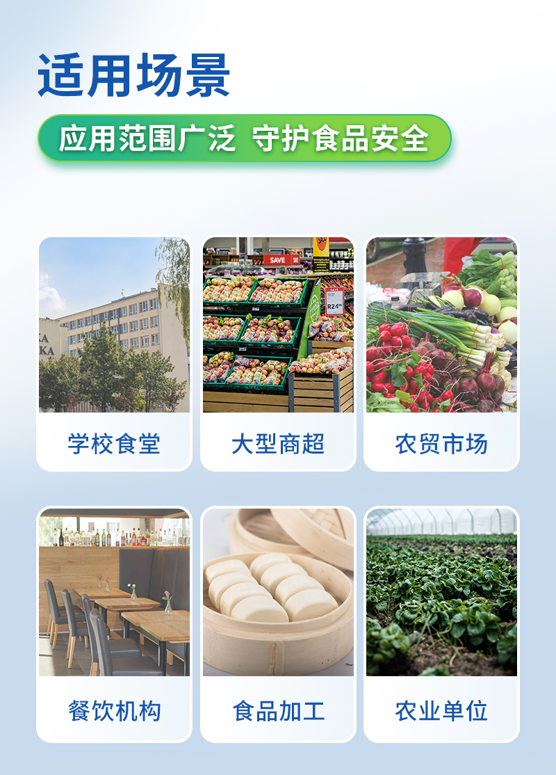目前廣泛應(yīng)用于市場(chǎng)監(jiān)管局、檢測(cè)中心、衛(wèi)生監(jiān)督部門、農(nóng)業(yè)部門、院校及各單位食堂、、商超市場(chǎng)、司法部門、餐飲機(jī)構(gòu)、檢驗(yàn)檢疫部門等單位使用。