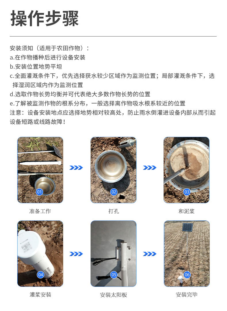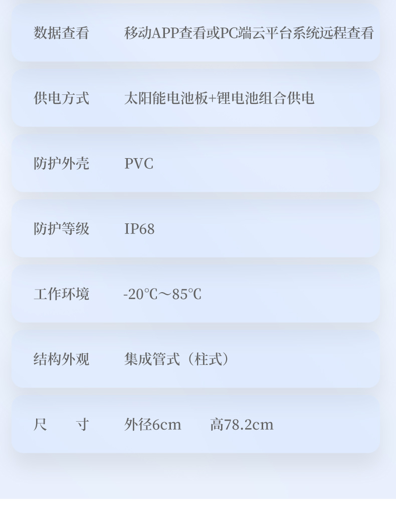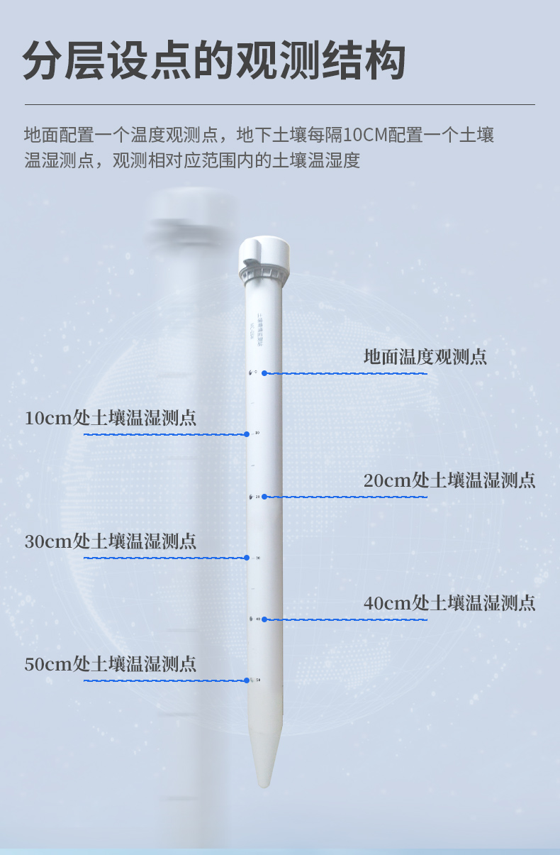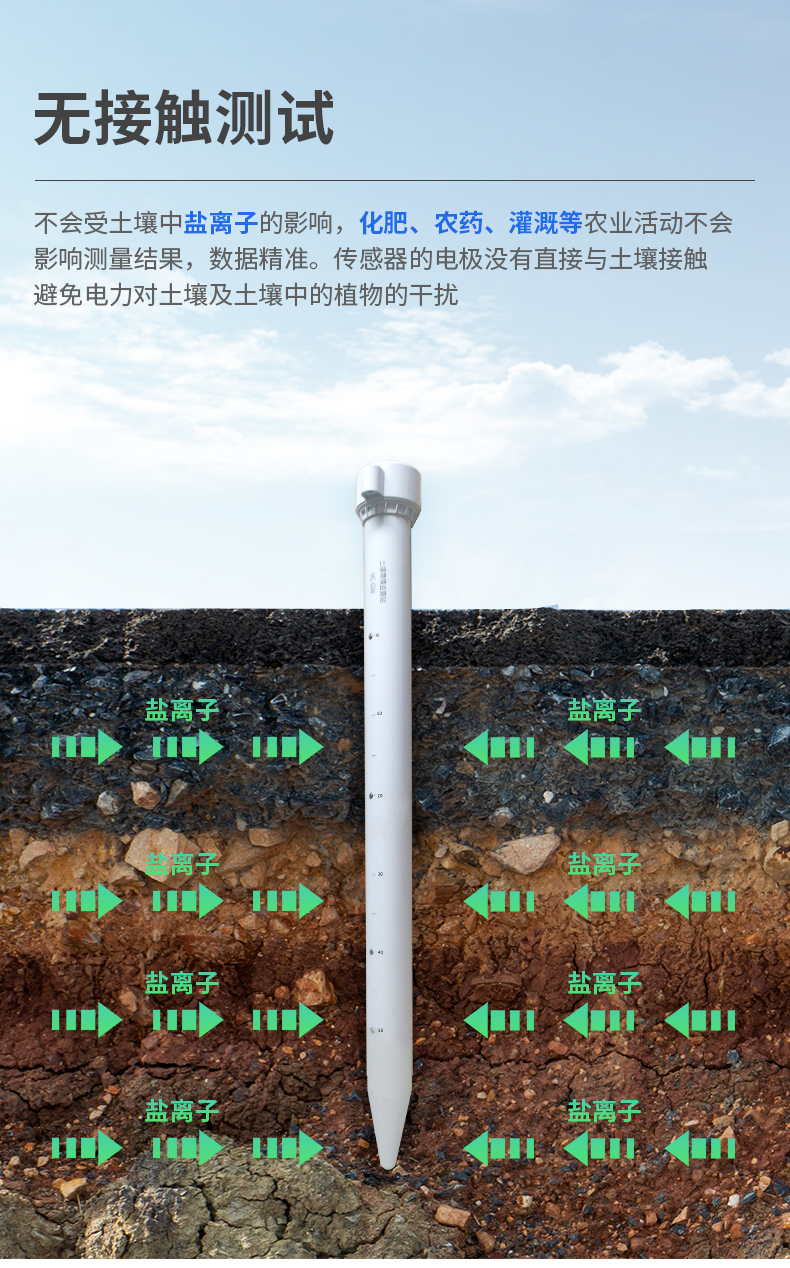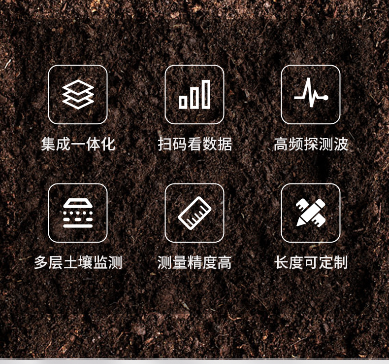 | 1、外殼采用PVC塑料管,內部發(fā)射近1G赫茲的高頻探測波,可以穿透塑料管,有效感知土壤環(huán)境。 | 2、不受土壤中鹽離子的影響,化肥、農藥、灌溉等農業(yè)活動不會影響測量結果,數據精準。 | 3、傳感器的電極沒有直接與土壤接觸,避免電力對土壤及土壤中的植物的干擾。 | 4、產品采用標準的Modbus-RTU485通信模式,最遠通信2000米。 | 5、支持10-30V寬電壓充電。 | 6、一體式可同時監(jiān)測四層土壤溫濕度。 |
