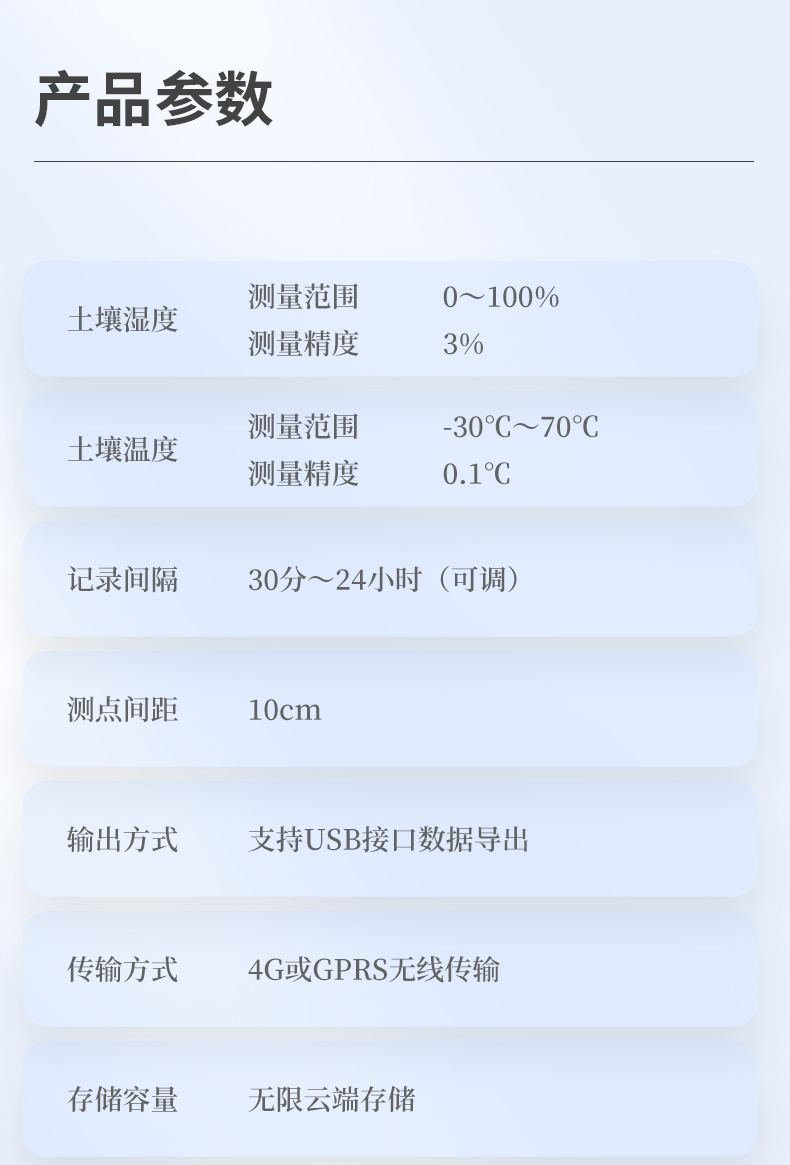 | 1、工作溫度:-40℃-80℃ | 2、土壤濕度:0~100%(±5%) | 3、土壤溫度:-15℃~35℃(±0.5℃) | 4、測點間距:10cm | 5、供電方式:10-30V寬直流供電 | 6、外殼:PVC塑料管 | 7、防護等級:地面以下部分IP68 | 8、輸出信號:RS485(Modbus協議) | 9、功耗:四層 0.9W |