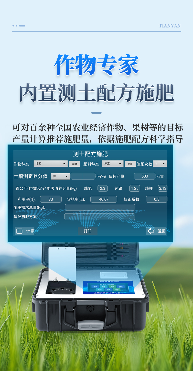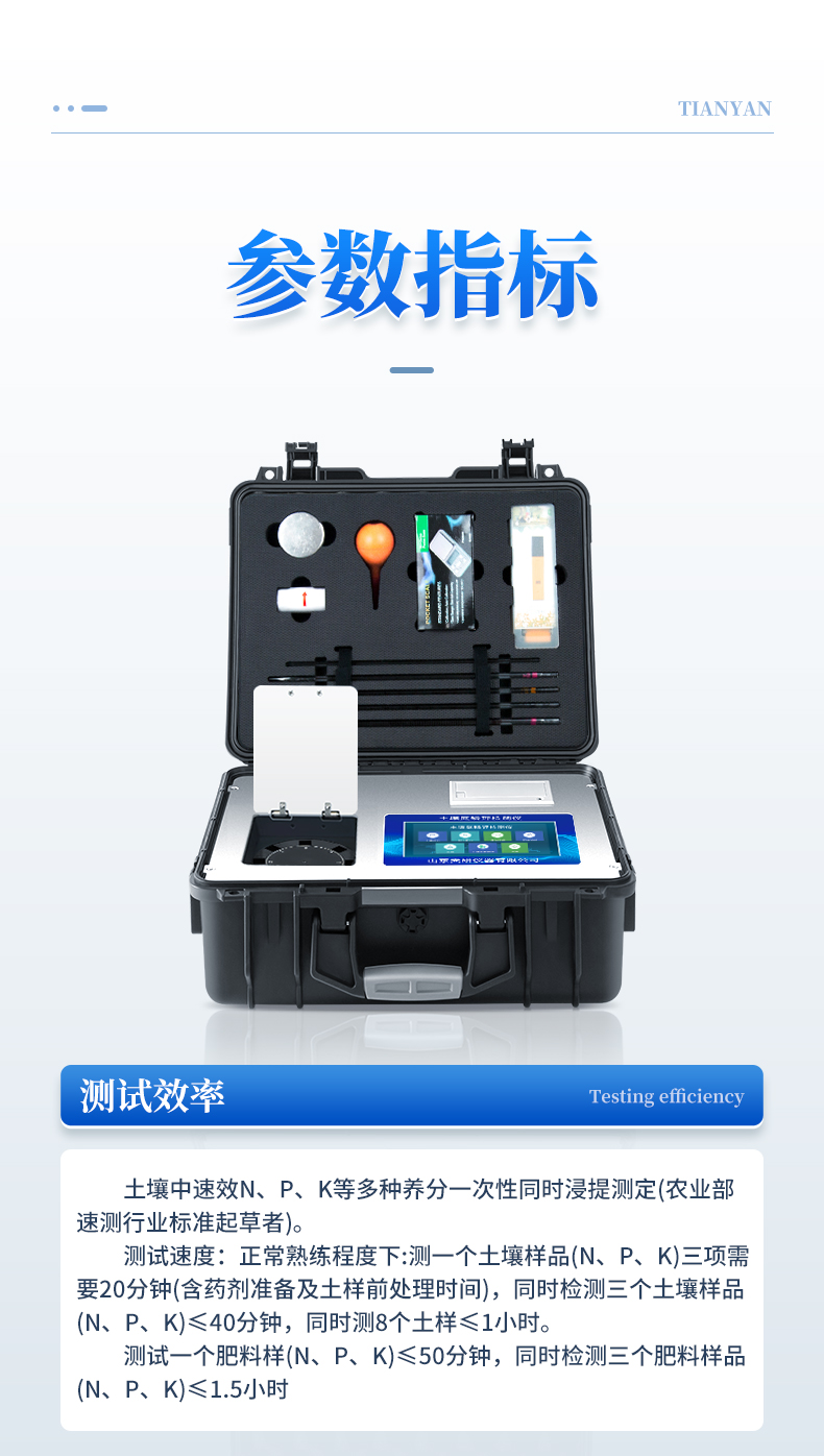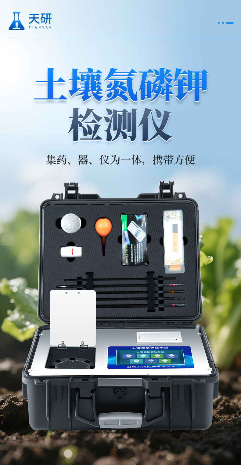 土壤氮磷鉀檢測儀器集藥、器、儀為一體,攜帶方便,相當(dāng)于一個小型移動實驗室,無需用戶自配附件,亦可靈活野外流動測試。適于農(nóng)業(yè)服務(wù)部門或農(nóng)資經(jīng)銷商、合作社、肥料廠商、大種植戶測土施肥和鑒別肥料真假。 檢測功能全:測試項目國內(nèi)外全面,除標(biāo)配試劑外,其他各類藥劑均可加配選購。