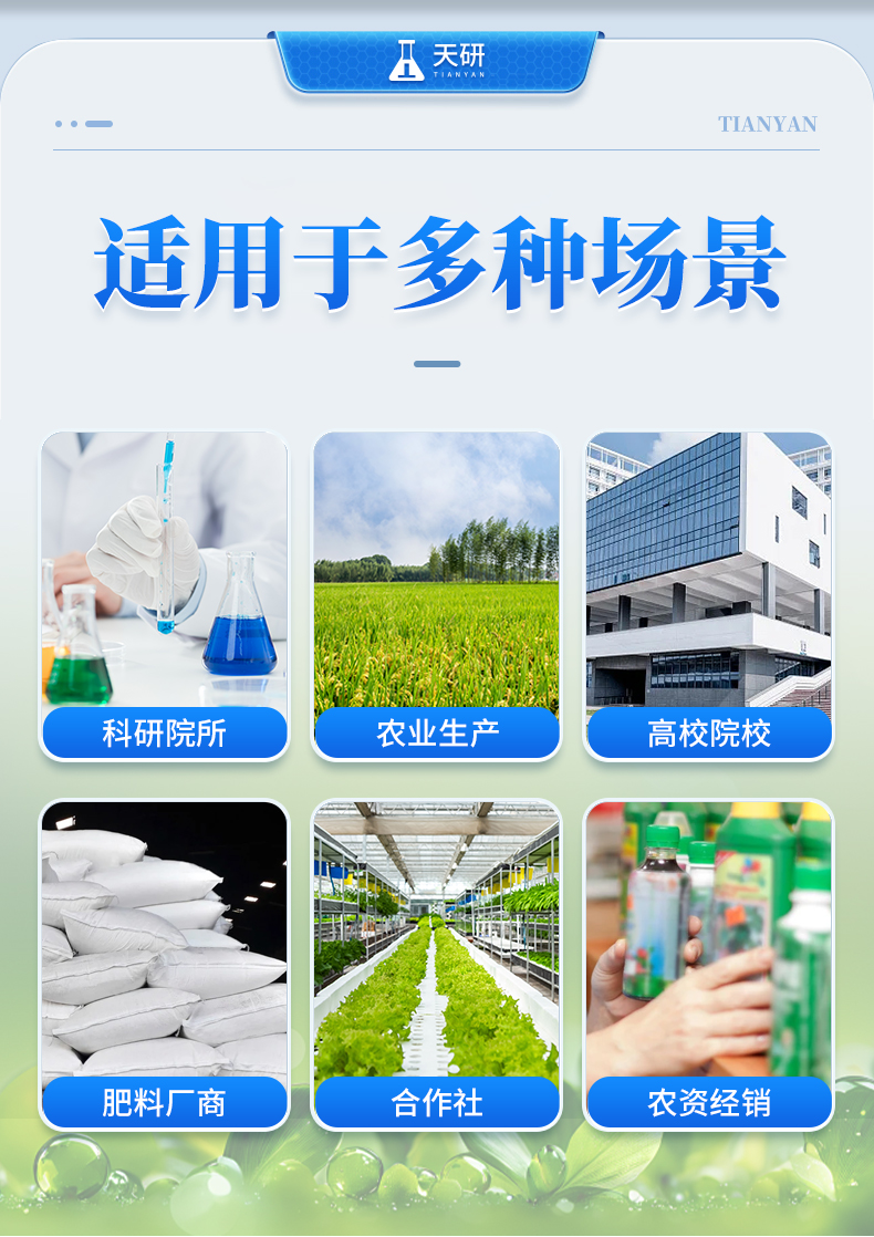 1、土壤養(yǎng)分:●土壤銨態(tài)氮、土壤有效磷、土壤速效鉀、土壤硝態(tài)氮、土壤水解氮、土壤全氮、土壤全磷、土壤全鉀、土壤有機質(zhì)(丘林法)、土壤有機質(zhì)(浸提法)、土壤總有機碳、土壤碳氮比、PH值、含鹽量、水分。 ●土壤中微量元素:土壤鈣、土壤鎂、土壤硫、土壤硅、土壤硼、土壤鐵、土壤銅、土壤錳、土壤鋅、土壤氯、土壤鉬; ●土壤重金屬:土壤鉛、土壤砷、土壤鎘、土壤鉻、土壤汞、土壤鎳、土壤鋁、土壤氟、土壤鈦、土壤硒。 | 2、肥料養(yǎng)分:●單質(zhì)肥:氮肥中銨態(tài)氮、肥料硝態(tài)氮、尿素氮、縮二脲、磷肥中磷、磷肥中水溶性磷、鉀肥中鉀; ●復(fù)合肥全氮、復(fù)合肥全磷、復(fù)合肥全鉀; ●有機肥全氮、有機肥全磷、有機肥全鉀、有機肥硝態(tài)氮、有機肥速效磷、有機肥速效鉀、有機肥酸解氮、有機質(zhì); ●水溶性腐植酸(風(fēng)化煤)、水溶性腐植酸(褐煤)、水溶性腐植酸(泥炭)、游離態(tài)腐植酸(風(fēng)化煤)、游離態(tài)腐植酸(褐煤)、游離態(tài)腐植酸(泥炭); ●水溶肥全氮、水溶肥全磷、水溶肥全鉀; ●葉面肥全氮、葉面肥全磷、葉面肥全鉀; ●各種肥料微量元素:肥料鈣、肥料鎂、肥料硫、肥料硅、肥料硼、肥料鐵、肥料銅、肥料錳、肥料鋅、肥料氯、肥料鉬; ●肥料重金屬:肥料鉛、肥料砷、肥料鎘、肥料鉻、肥料汞、肥料鎳、肥料鋁、肥料氟、肥料鈦、肥料硒。 | 3、鮮作物營養(yǎng):●作物硝態(tài)氮、作物銨態(tài)氮、作物磷、作物鉀; ●作物中微量元素:作物鈣、作物鎂、作物硫、作物硅、作物硼、作物鐵、作物銅、作物錳、作物鋅、作物氯、作物鉬; ●作物中硝酸鹽、亞硝酸鹽。 | 4、干植株營養(yǎng):●植株全氮、植株全磷、植株全鉀 | 5、煙葉營養(yǎng):●全氮、全磷、全鉀、還原糖、水溶性總糖、硼、錳、鐵、銅、鈣、鎂等20項。 | 6、食品(水果、蔬菜等):●硝酸鹽、亞硝酸鹽、重金屬(鉛、鉻、鎘、砷、汞)等項。 | 7、水質(zhì)中:●銨態(tài)氮、水中磷、水中鉀、硝酸鹽、亞硝酸鹽、硬度、PH、鐵、銅、錳、鋅、硼、氯、硫、硅、鉬等 |
