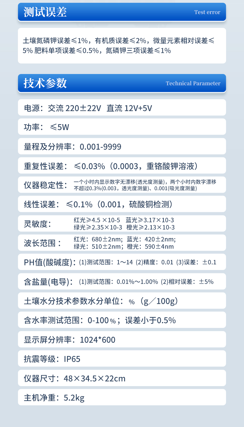 | 1、電源:交流 220±22V 直流 12V+5V(儀器內(nèi)置鋰電池也可用車載電源) | 2、功率: ≤5W | 3、量程及分辨率:0.001-9999 | 4、重復(fù)性誤差: ≤0.02%(0.0002,重鉻酸鉀溶液) | 5、儀器穩(wěn)定性:一個小時內(nèi)顯示數(shù)字無漂移(透光度測量);兩個小時內(nèi)數(shù)字漂移不超過0.3%(0.003,透光度測量)、0.001(吸光度測量)。 | 6、線性誤差: ≤0.1%(0.001,硫酸銅檢測) | 7、靈敏度:紅光≥4.5 ×10-5 藍(lán)光≥3.17×10-3 綠光≥2.35×10-3 橙光≥2.13×10-3 | 8、波長范圍 :紅光:680±2nm; 藍(lán)光:420±2nm; 綠光:510±2nm;橙光:590±4nm | 9、PH值(酸堿度): (1)測試范圍:1~14 (2)精度:0.01 (3)誤差:±0.1 | 10、含鹽量(電導(dǎo)):(1)測試范圍:0.01%~1.00% (2)相對誤差:±5% | 11、土壤水分技術(shù)參數(shù)水分單位:﹪(g/100g);含水率測試范圍:0-100﹪;誤差小于0.5% | 12、顯示屏分辨率:1024*600 | 13、抗震等級:IP65 | 14、儀器尺寸:48×34.5×22cm。 | 15、主機凈重:5.2kg | 16、包裝尺寸:510*390*375mm | 17、包裝重量:11.5kg |