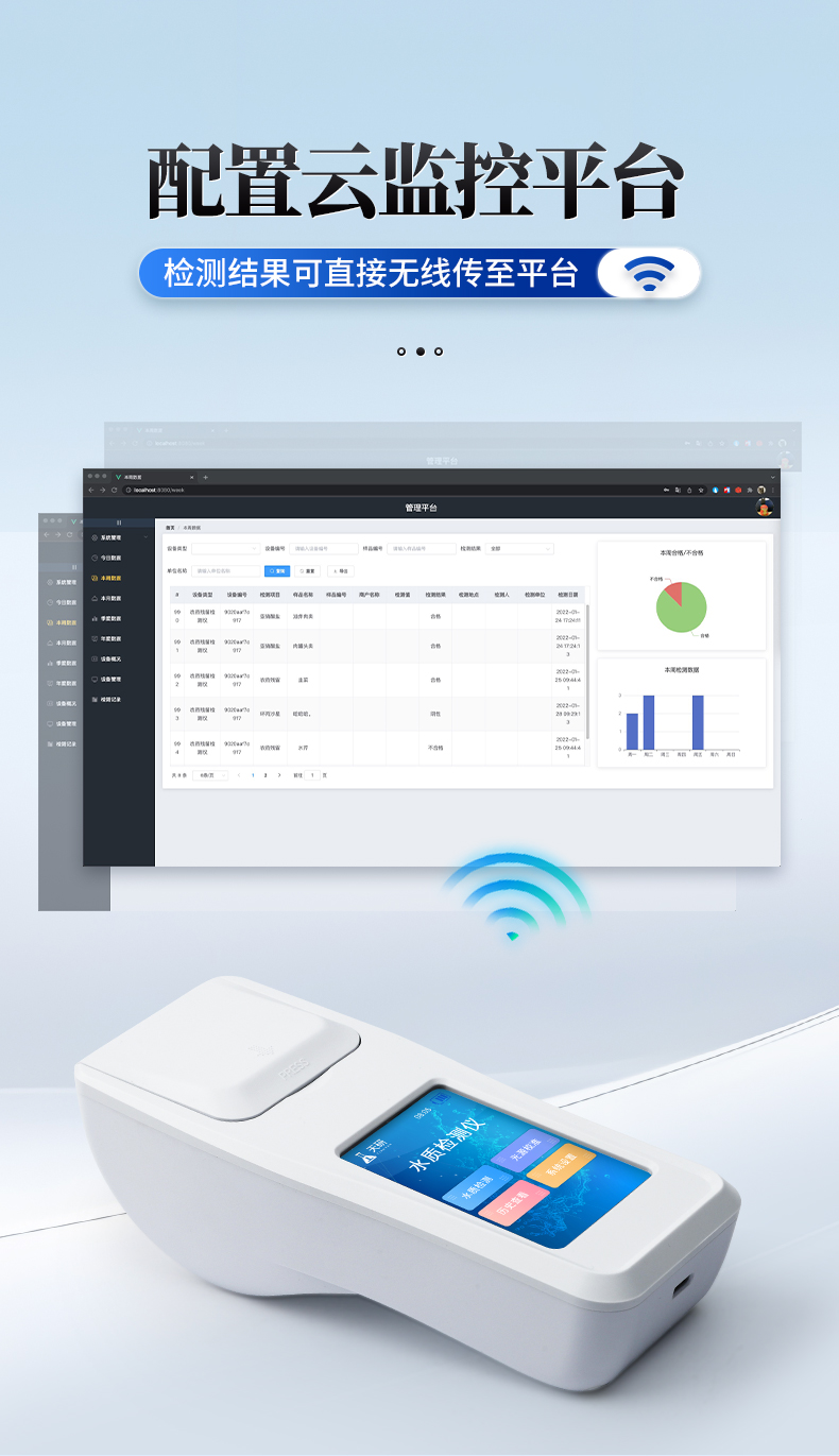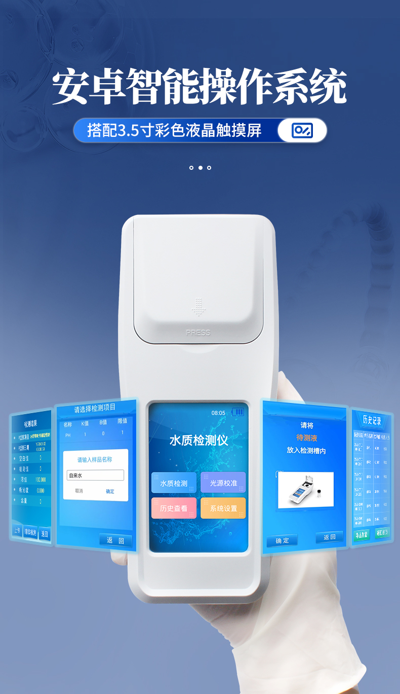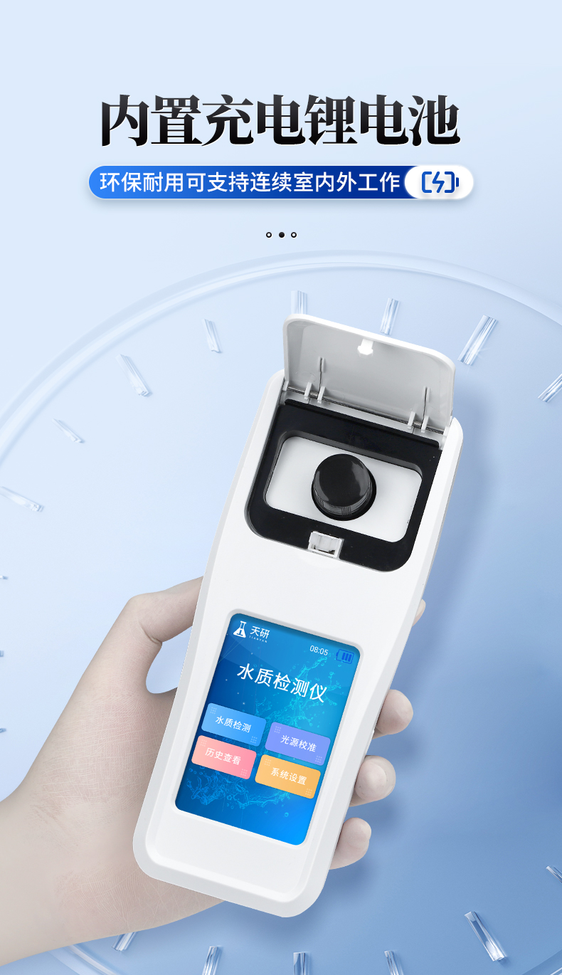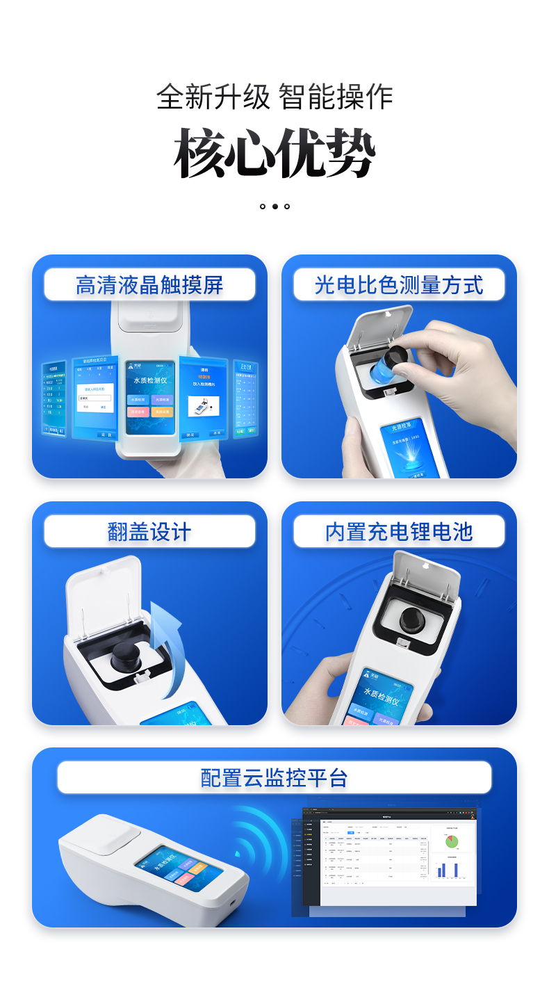 | 1、安卓智能系統(tǒng),操作更佳簡便快捷; | 2、配置云監(jiān)控平臺,檢測結(jié)果可直接無線傳至平臺,進(jìn)行水質(zhì)長短期分析,輔助管理; | 3、內(nèi)置操作流程、操作簡單、無需培訓(xùn)、直接上手; | 4、檢測速度更快,現(xiàn)場讀取數(shù)據(jù); | 5、便攜式體積小,重量輕,方便戶外檢測; | 6、外形小巧美觀,工作穩(wěn)定免維護(hù),具有較好的性價比; | 7、采用進(jìn)口冷光源,光學(xué)性能穩(wěn)定,壽命長達(dá)10萬小時; | 8、交直流兩用,內(nèi)置充電鋰電池,環(huán)保耐用可支持連續(xù)室內(nèi)外工作。 |