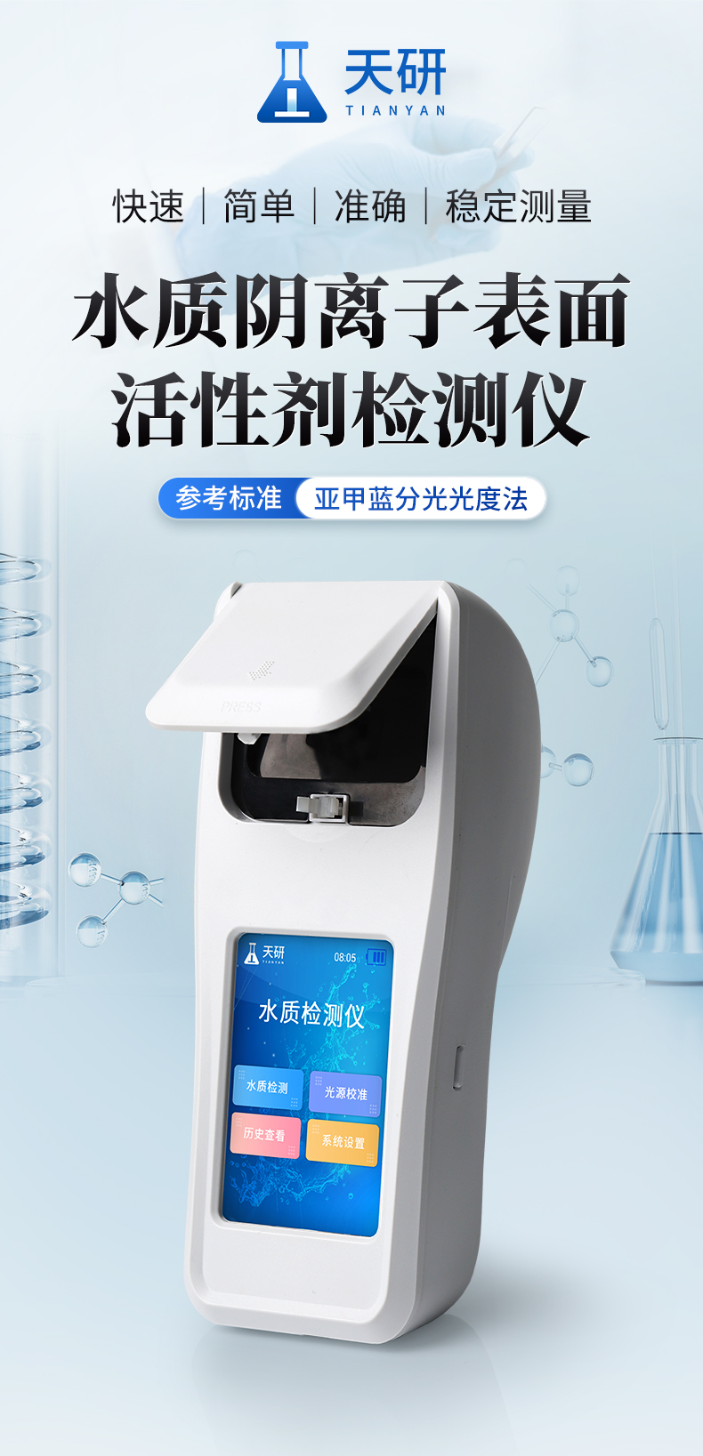便攜式陰離子表面活性劑檢測儀參考《水質(zhì) 陰離子表面活性劑的測定 亞甲藍(lán)分光光度法》方法設(shè)計制造,本儀器采用高精度長壽命冷光源,可“快速、簡單、準(zhǔn)確、穩(wěn)定”進(jìn)行測量,儀器廣泛應(yīng)用于飲用水、地表水、生活污水水、廢水等的水質(zhì)陰離子表面活性劑含量的測定。