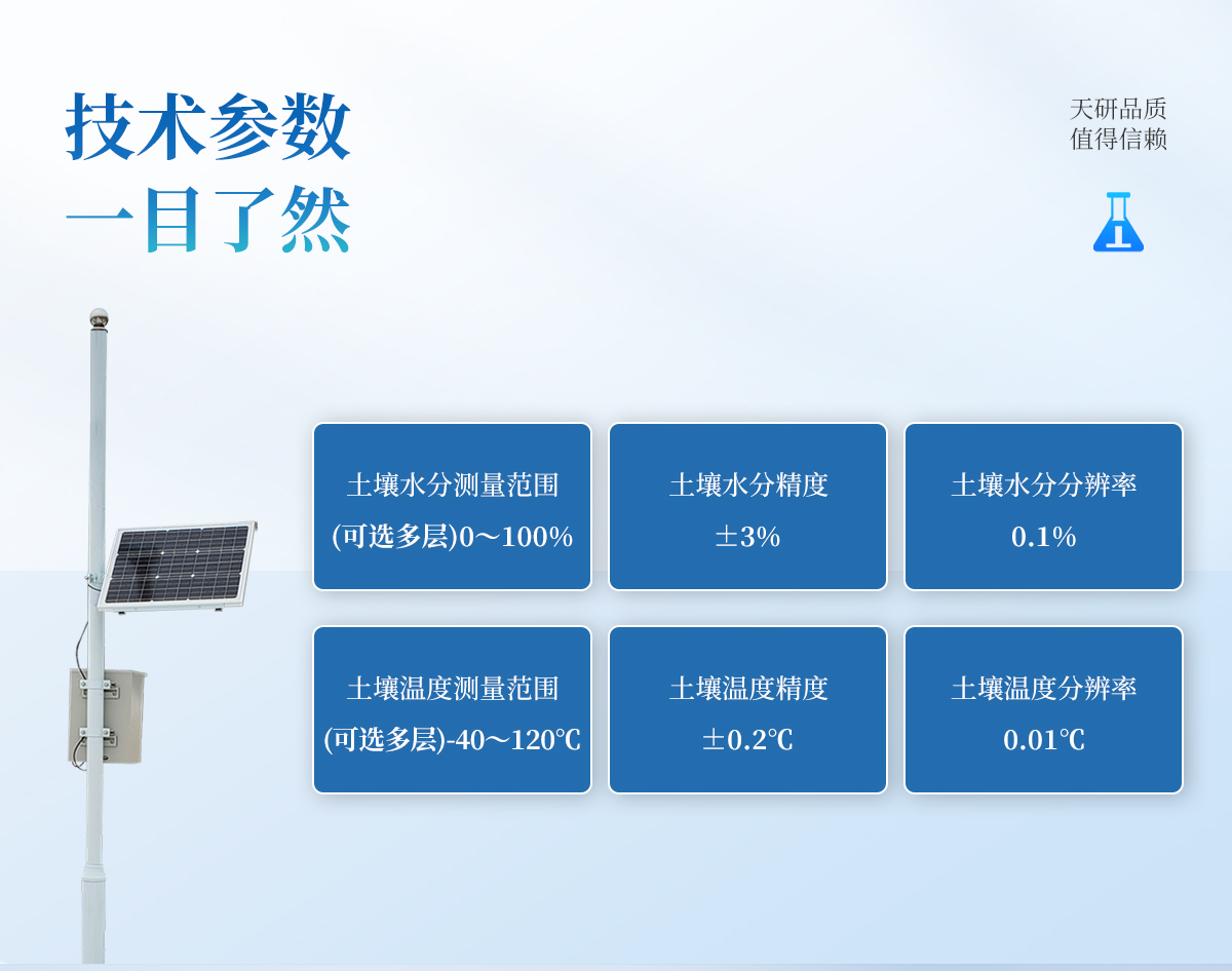 | 土壤濕度 測量范圍:0~100% 測量精度:3% | 土壤溫度 測量范圍:-30℃~70℃ 測量精度:0.1℃ | 記錄間隔:30分~24小時(可調(diào)) | 測點間距:10cm | 輸出方式:支持USB接口數(shù)據(jù)導出 | 傳輸方式:4G或GPRS無線傳輸 | 存儲容量:無限云端存儲 | 數(shù)據(jù)查看:移動APP查看或PC端云平臺系統(tǒng)遠程查看 | 供電方式:太陽能電池板+鋰電池組合供電 | 防護外殼:PVC | 防護等級:IP68 | 工作環(huán)境:-20℃~85℃ | 結構外觀:集成管式(柱式) | 尺 寸:外徑6cm 高78.2cm |