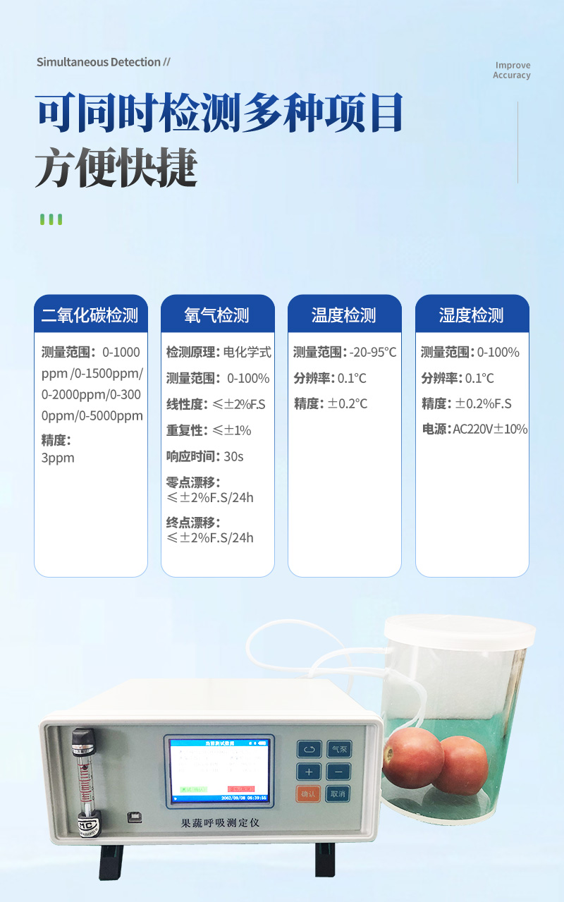 果蔬呼吸測(cè)定儀專門用于常溫、冷藏庫、氣調(diào)庫、超市冷柜等儲(chǔ)藏條件下的果品和蔬菜呼吸強(qiáng)度的測(cè)定和分析研究。該儀器的特點(diǎn)是可以根據(jù)果蔬的大小來選擇不同體積的呼吸室,加快了平衡和測(cè)定時(shí)間;可以同時(shí)顯示呼吸室的CO2濃度、O2濃度、溫度和濕度。該儀器具有多功能、高精度、快速、**、方便等特