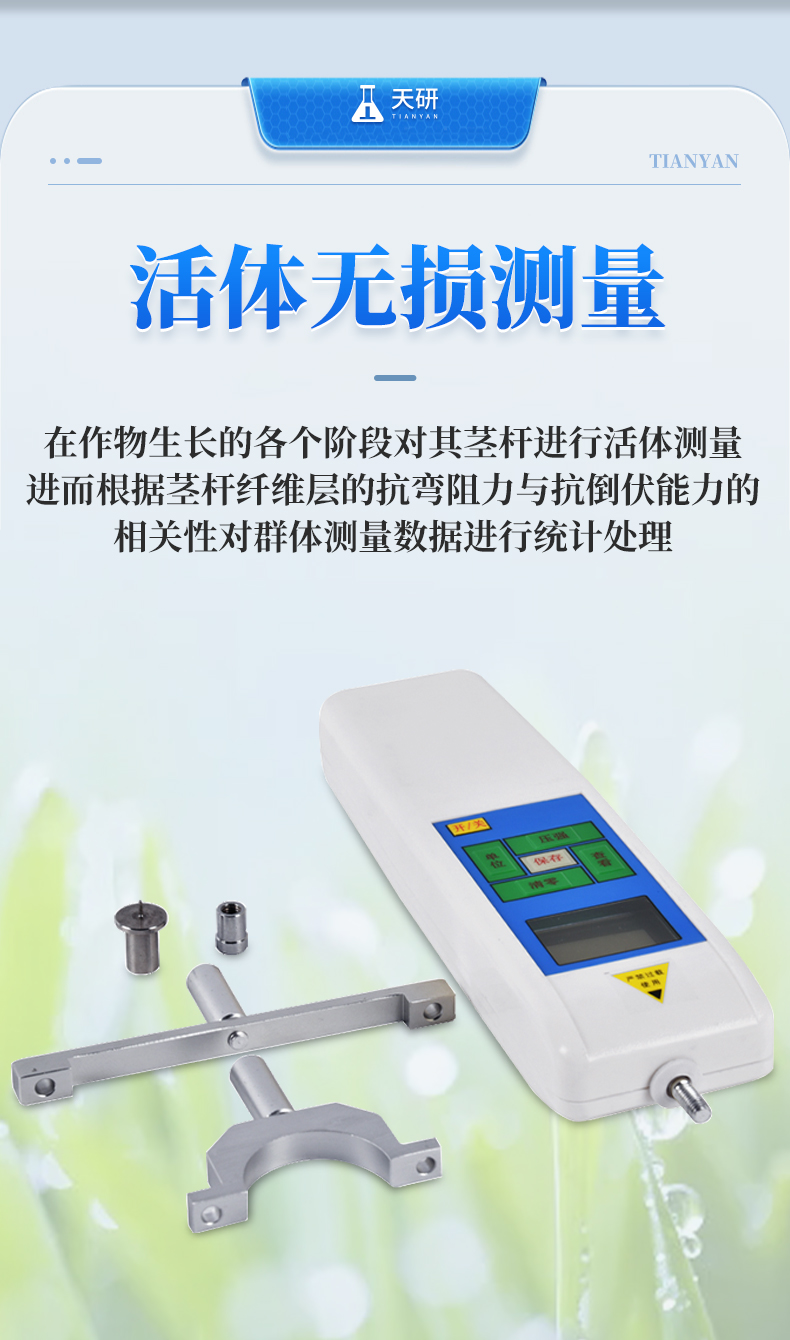 植物抗倒伏測定儀是決定農(nóng)作物抗倒伏能力的一個關(guān)鍵因素,玉米、高粱、煙草等作物的倒伏給機械收割造成很大困難,導(dǎo)致大量浪費。同時,作物倒伏還會造成光照不足,嚴重影響產(chǎn)量。通過在作物生長各階段對其莖稈進行活體測量,根據(jù)莖稈纖維層抗彎阻力與抗倒伏能力的相關(guān)性進行群體數(shù)據(jù)統(tǒng)計處理,