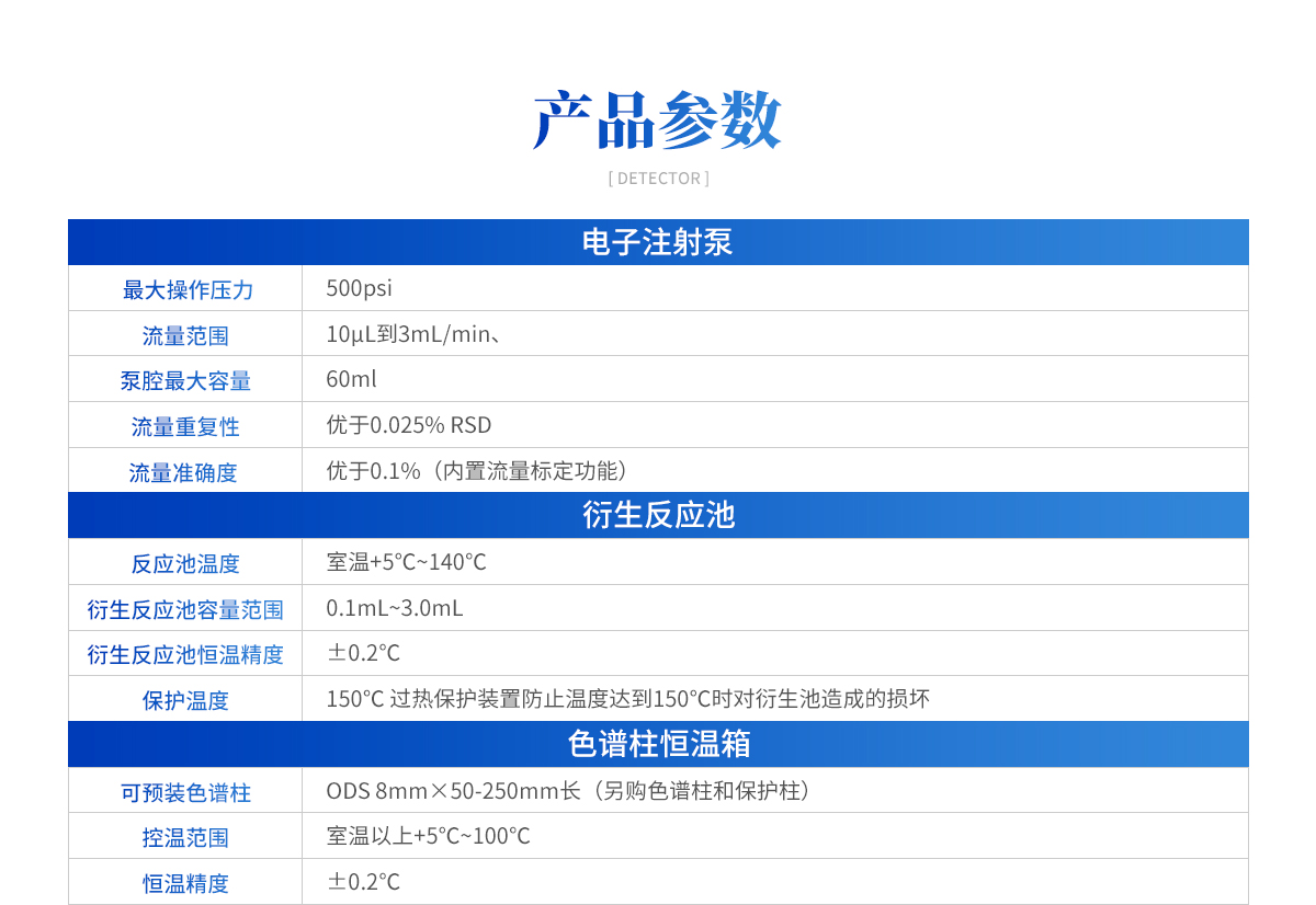 | 1.電子注射泵: 1.1 無脈動雙螺旋桿高壓注射泵,無脈動液體流動更好的提高檢測靈敏度和一致性; 1.2 最大操作壓力:500psi; 1.3 流量范圍:10μL到3mL/min; 1.4 泵腔最大容量:60ml; 1.5 流量重復(fù)性:優(yōu)于0.025% RSD; 1.6 流量準確度:優(yōu)于0.1%(內(nèi)置流量標定功能); | 2.衍生反應(yīng)池: 2.1 獨立控溫檢測池,滿足不同應(yīng)用需要; 2.2 反應(yīng)池溫度:室溫+5℃~140℃; 2.3 衍生反應(yīng)池容量范圍:0.1mL~3.0mL; 2.4 衍生反應(yīng)池恒溫精度:±0.2℃; 2.5 保護溫度:150℃(過熱保護裝置防止溫度達到150℃時對衍生池造成的損壞); |