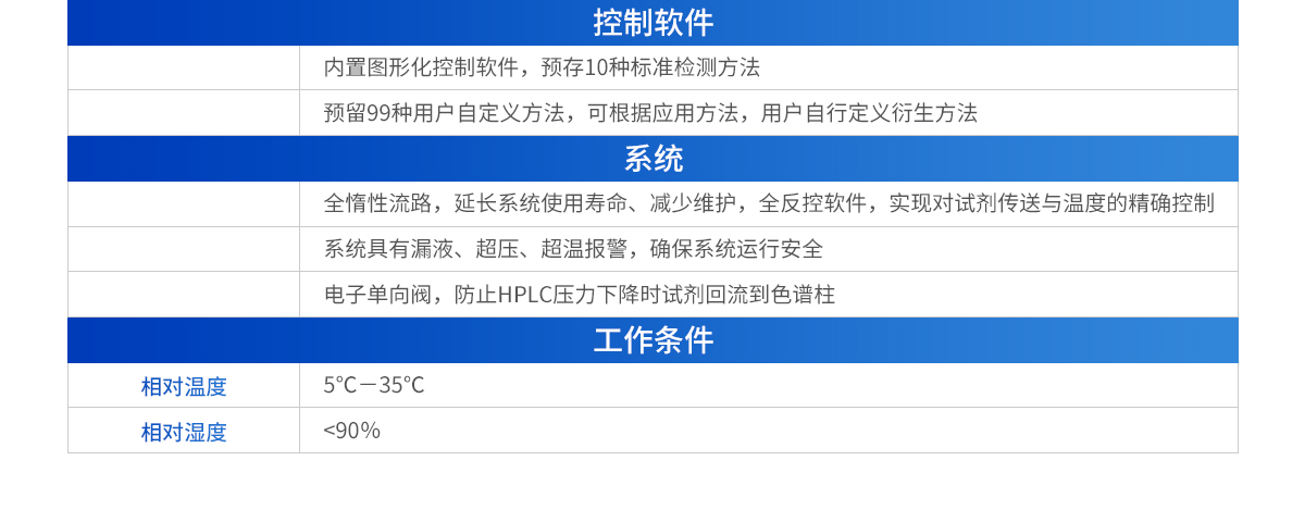 | 3.自帶色譜柱恒溫箱: 3.1 內(nèi)置色譜柱恒溫箱,保障柱后死體積最小; 3.2 可預(yù)裝色譜柱:ODS 8mm×50-250mm長(另購色譜柱和保護柱); 3.3 控溫范圍:室溫以上+5℃~100℃; 3.4 恒溫精度:±0.2℃; 4.控制軟件: 4.1 內(nèi)置圖形化控制軟件,預(yù)存10種標準檢測方法; 4.2 預(yù)留99種用戶自定義方法,可自行定義衍生方法; | 5.系統(tǒng): 5.1 全惰性流路,延長系統(tǒng)使用壽命、減少維護,全反控軟件**控制試劑傳送與溫度; 5.2 系統(tǒng)具有漏液、超壓、超溫報警,確保運行安全; 5.3 電子單向閥,防止HPLC壓力下降時試劑回流到色譜柱; 6.工作條件: 6.1 相對溫:5℃-35℃; 6.2 相對濕度:<90%; |