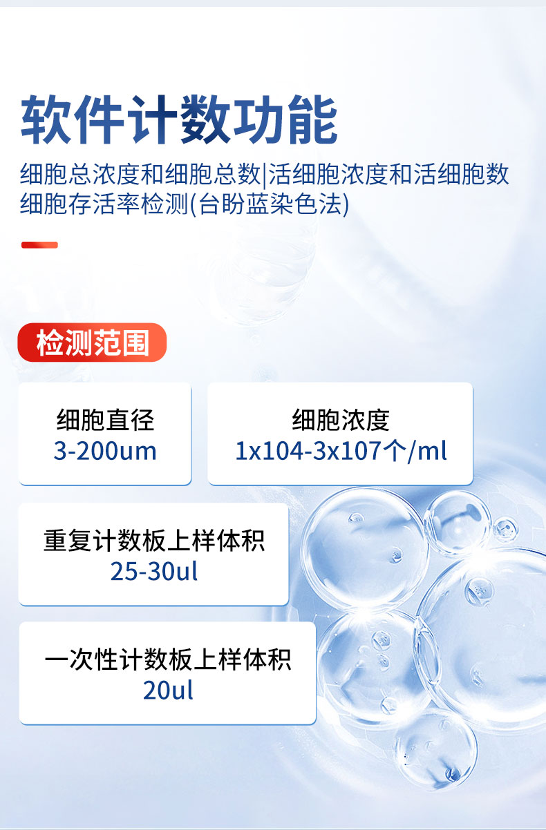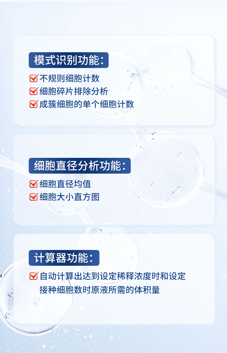 細(xì)胞計數(shù)儀通過細(xì)胞成像技術(shù)結(jié)合傳統(tǒng)血球計數(shù)原理,經(jīng)計數(shù)軟件對細(xì)胞分布圖像進(jìn)行自動計數(shù)、細(xì)胞聚團(tuán)率分析、細(xì)胞活力分析、細(xì)胞大小分析,并繪制細(xì)胞大小柱狀圖等。該儀器檢測快速、操作簡單、結(jié)果準(zhǔn)確,可滿足多種細(xì)胞檢測場景需求。