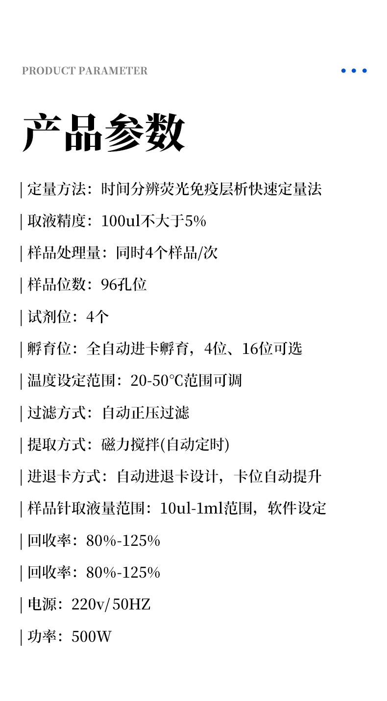| 1、儀器可自動(dòng)完成加液、提取、移液、混勻、孵育、檢測(cè)、數(shù)據(jù)處理、打印等整個(gè)真菌毒素檢測(cè)流程工作; | 2、定量方法:時(shí)間分辨熒光免疫層析快速定量法; | 3、取液精度:100ul不大于5%; | 4、樣品處理量:同時(shí)4個(gè)樣品/次; |