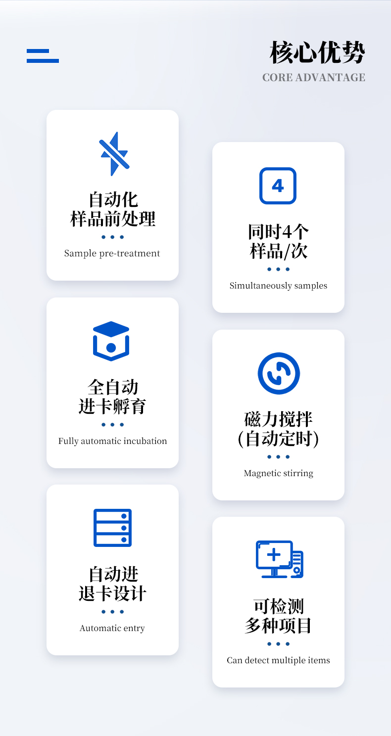 本產(chǎn)品是以真菌毒素分析前處理技術(shù)開(kāi)發(fā)的全自動(dòng)檢測(cè)儀,可自動(dòng)完成提取、混勻、移液、孵育、檢測(cè)、數(shù)據(jù)處理、打印等全流程工作。該儀器基于光電檢測(cè)原理的免疫熒光檢測(cè)技術(shù),配套專(zhuān)用熒光免疫試劑,通過(guò)自動(dòng)化樣品前處理替代人工操作,可檢測(cè)黃曲霉B1、嘔吐毒素等多種真菌毒素,實(shí)用性強(qiáng)、操作方便,能節(jié)省大量人力物力時(shí)間成本,適用于糧油質(zhì)檢、糧庫(kù)收儲(chǔ)、飼料企業(yè)、食品加工、第三方檢測(cè)、政府監(jiān)管等單位。