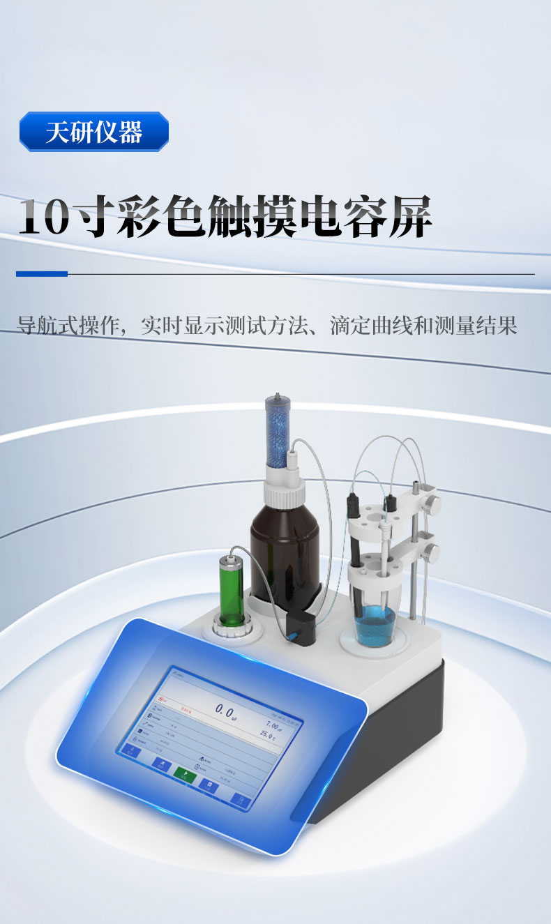 2. 10 寸彩色觸摸電容屏,導(dǎo)航式操作,實時顯示測試方法、滴定曲線和測量結(jié)果。