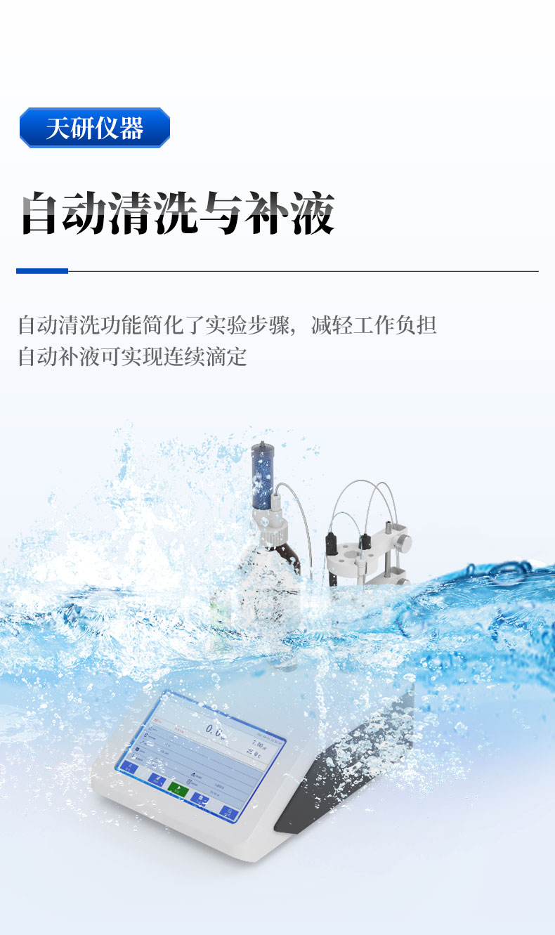 7. 自動清洗與補液:自動清洗功能簡化了實驗步驟,減輕工作負擔(dān);自動補液可實現(xiàn)連續(xù)滴定。所有管路采用自動清洗及多次潤洗方式,液接部分無溶液殘留并且可兼容絕大多數(shù)強酸堿及有機溶劑,有效減少樣品交叉污染,確保了數(shù)據(jù)的準(zhǔn)確可靠。