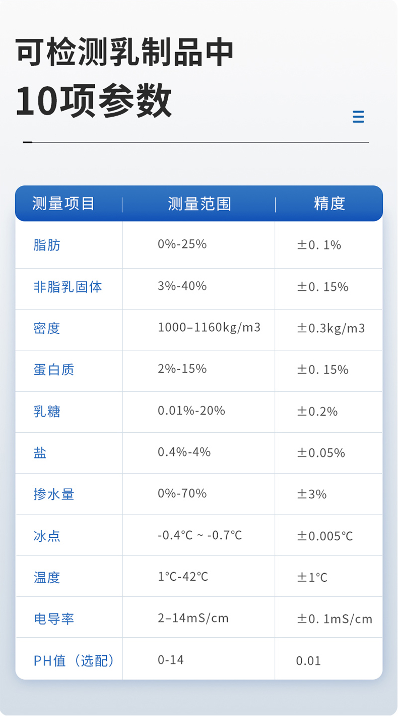 | 非脂乳固體 | 3℅ - 40℅ | ±0.15℅ |