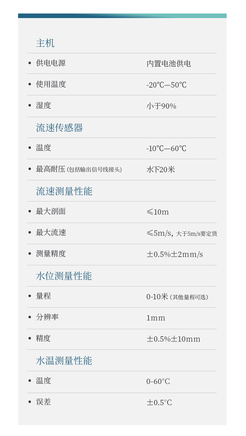 | 流速(m/s) | 0.02~6.00 | ±1.0%±1cm/s |