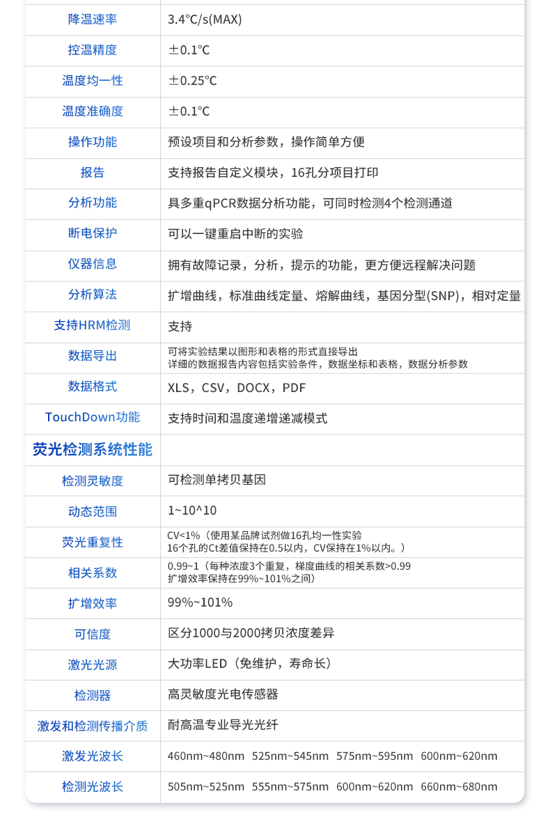 | 分析算法 | 擴(kuò)增曲線,標(biāo)準(zhǔn)曲線定量、熔解曲線,基因分型(SNP),相對定量 | |