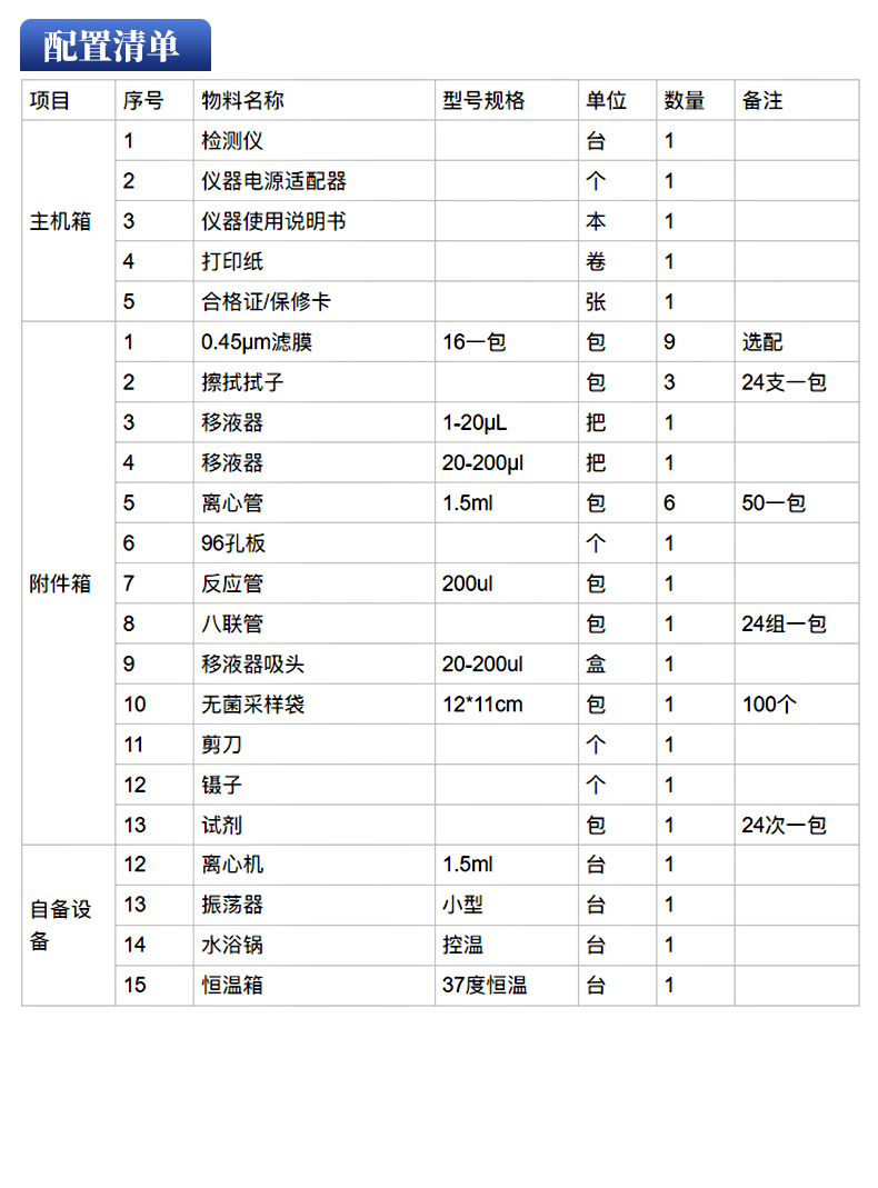 | 自備設(shè)備 | 1 | 離心機(jī) | 1.5毫升 | 臺(tái) | 1 | ||