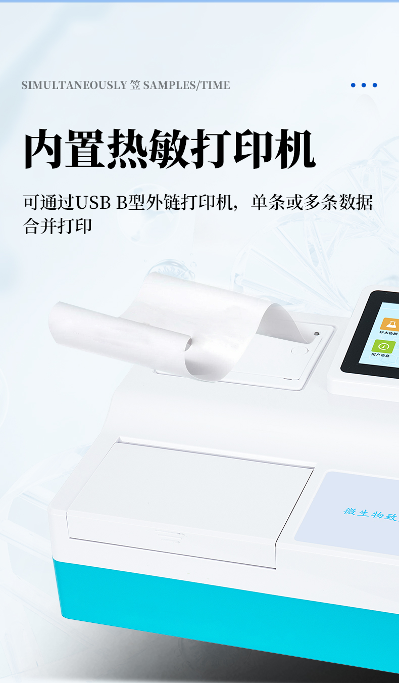 | 11. 打印功能 | 內(nèi)置熱敏打印機(jī),可通過USB B型外鏈打印機(jī),單條或多條數(shù)據(jù)合并打印,可打印檢測(cè)結(jié)果檢測(cè)報(bào)告可打印檢測(cè)項(xiàng)目、樣品名稱、檢測(cè)結(jié)果、結(jié)果判斷、檢測(cè)日期 、檢測(cè)單位、檢驗(yàn)人員、被檢測(cè)單位等信息;USB B型接口可連接A4打印機(jī)打印結(jié)果。 |