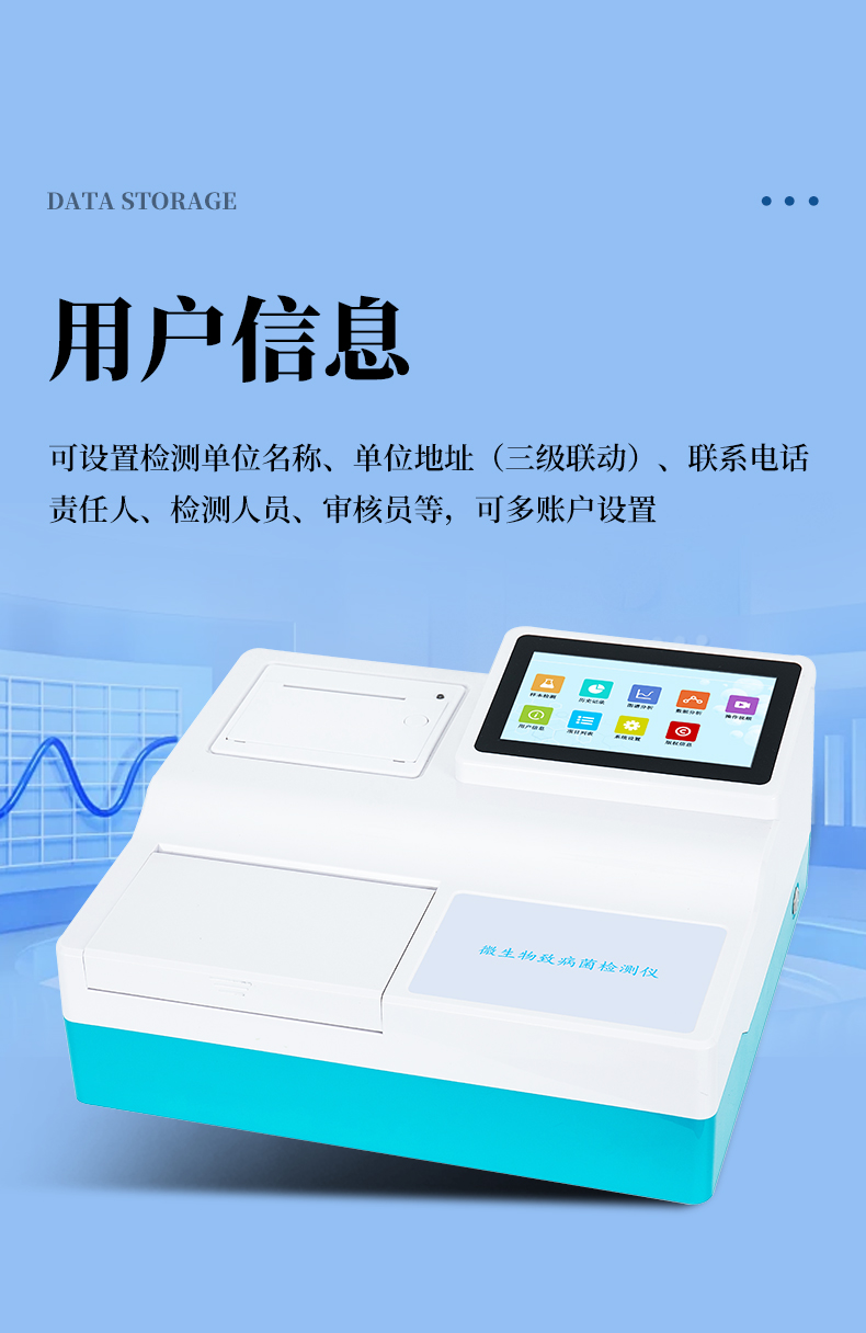 | 5. 用戶信息 | 可設(shè)置檢測(cè)單位名稱、單位地址(三級(jí)聯(lián)動(dòng))、聯(lián)系電話、責(zé)任人、檢測(cè)人員、審核員等,可多賬戶設(shè)置 |