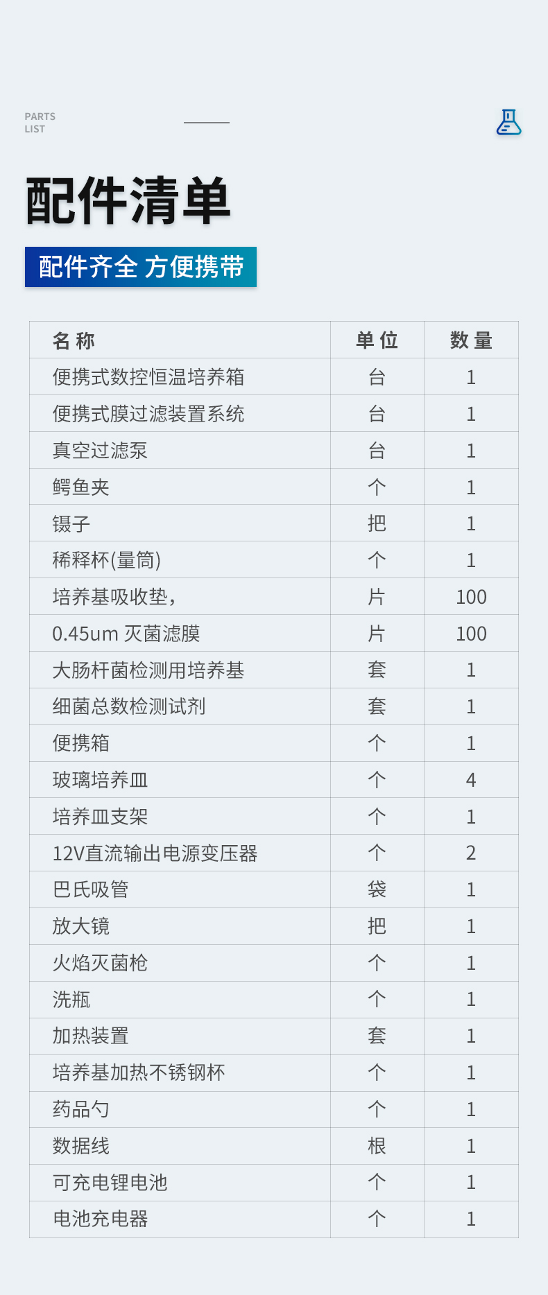 便攜式數(shù)控恒溫培養(yǎng)箱1臺(tái)、便攜式膜過(guò)濾裝置系統(tǒng)1臺(tái)、自動(dòng)真空過(guò)濾泵1臺(tái)、鱷魚夾1個(gè)、供100次細(xì)菌總數(shù)、大腸桿菌檢測(cè)用試劑配件1套、標(biāo)準(zhǔn)玻璃硅培養(yǎng)皿4個(gè),及培養(yǎng)皿支架1個(gè)、說(shuō)明書1份,合格證及保修卡1份。更詳細(xì)配件見附件。