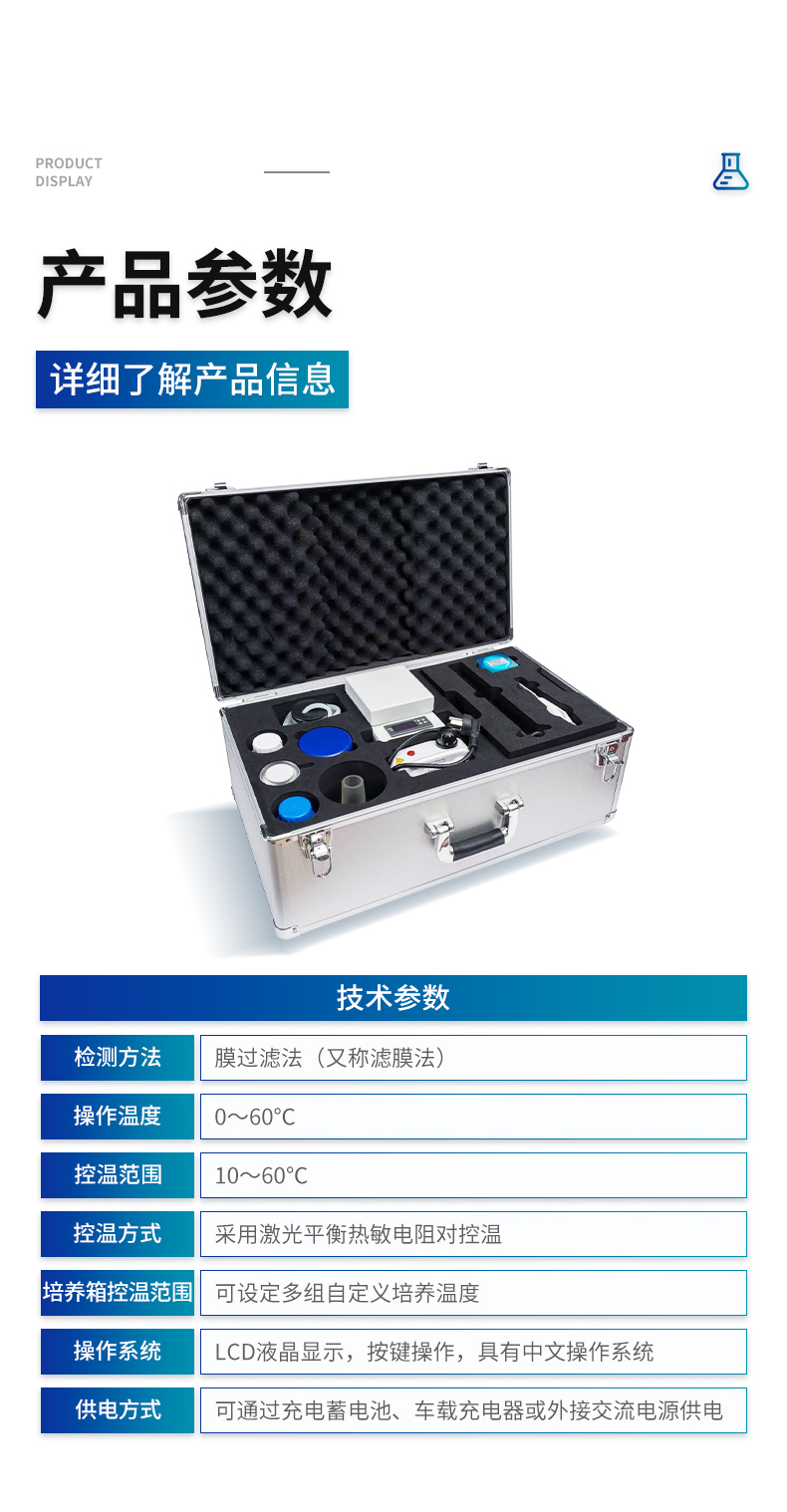 廣泛應(yīng)用于農(nóng)村飲用水、市政自來(lái)水、泳池水、分散式供水、養(yǎng)殖排放水等的細(xì)菌檢測(cè)。儀器采用多功能培養(yǎng)基支架,可配合預(yù)制式培養(yǎng)基用于菌落總數(shù)、總大腸菌數(shù)、糞大腸菌、埃希氏菌等多項(xiàng)目檢測(cè) 。 檢測(cè)方法: 膜過(guò)濾法(又稱濾膜法)。 技術(shù)指標(biāo):