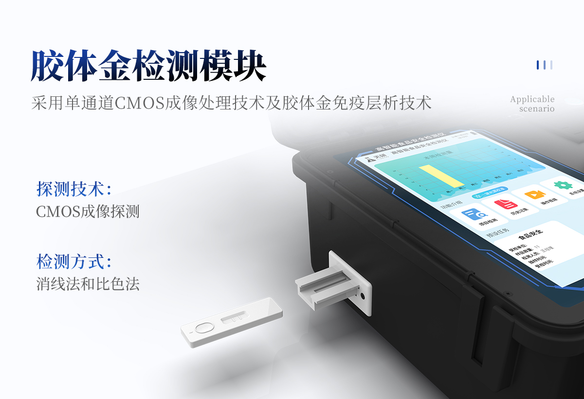| 1. 儀器設(shè)計 | 采用手提一體化系統(tǒng)檢測技術(shù),將分光光度模塊、膠體金檢測模塊、新型農(nóng)殘檢測模塊、數(shù)字化管理模塊、無線通訊模塊高度集成于一體,支持檢測200種食品安全檢測項目,同時預(yù)留升級檢測方法。 |