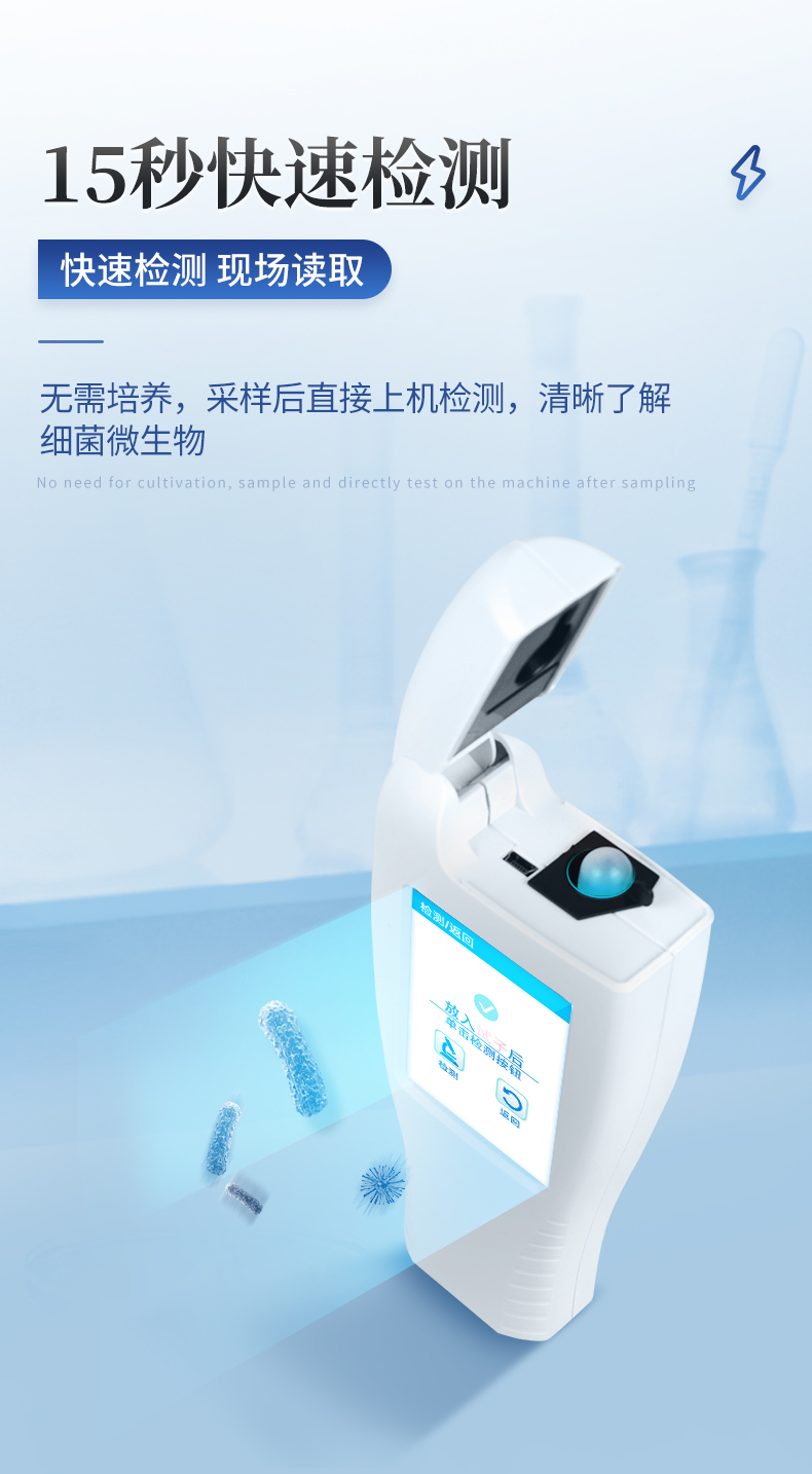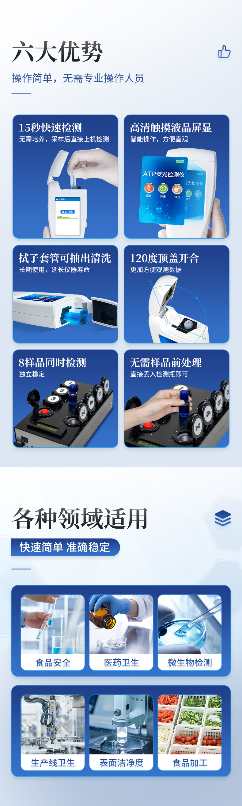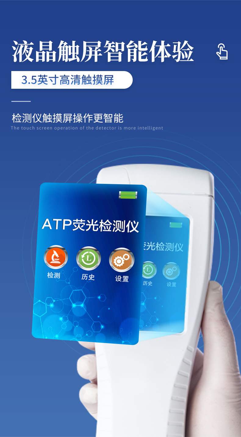 該設(shè)備為全新升級(jí)產(chǎn)品,大屏幕觸摸顯示屏,代替?zhèn)鹘y(tǒng)按鍵。操作采用生物化學(xué)反應(yīng)方法檢測ATP含量,ATP熒光檢測儀基于螢火蟲發(fā)光原理,利用“熒光素酶—熒光素體系”快速檢測三磷酸腺苷(ATP)。ATP拭子含有可以裂解細(xì)胞膜的試劑,能將細(xì)胞內(nèi)ATP釋放出來,與試劑中含有的特異性酶發(fā)生反應(yīng),產(chǎn)生光,再用熒光照度計(jì)檢測發(fā)光值,微生物的數(shù)量與發(fā)光值成正比,由于所有生物活細(xì)胞中含有恒量的ATP,所以ATP含量可以清晰地表明樣品中微生物與其他生物殘余的多少,用于判斷衛(wèi)生狀況。