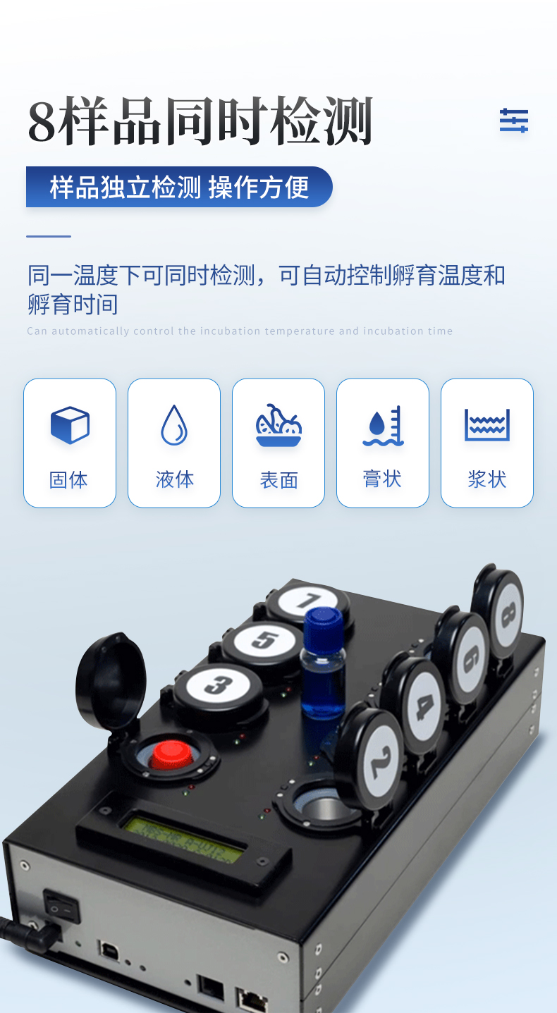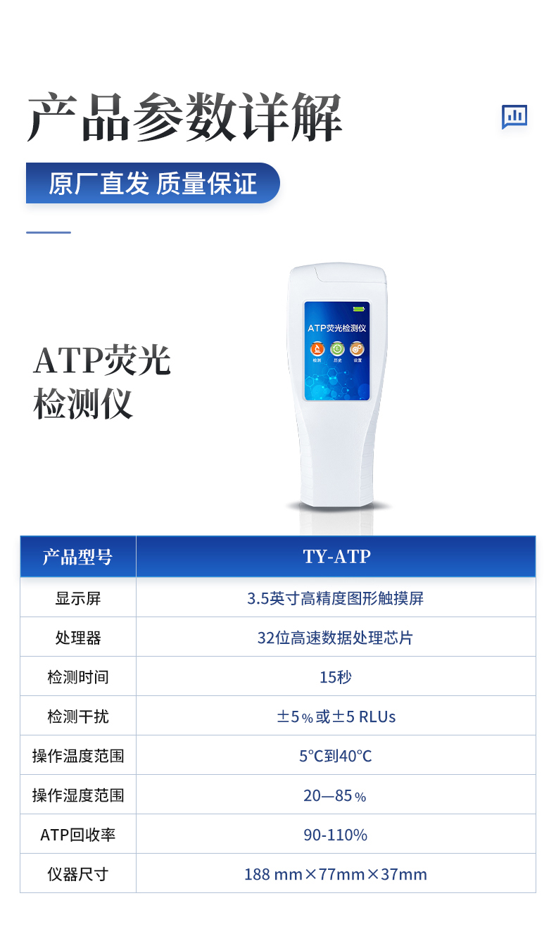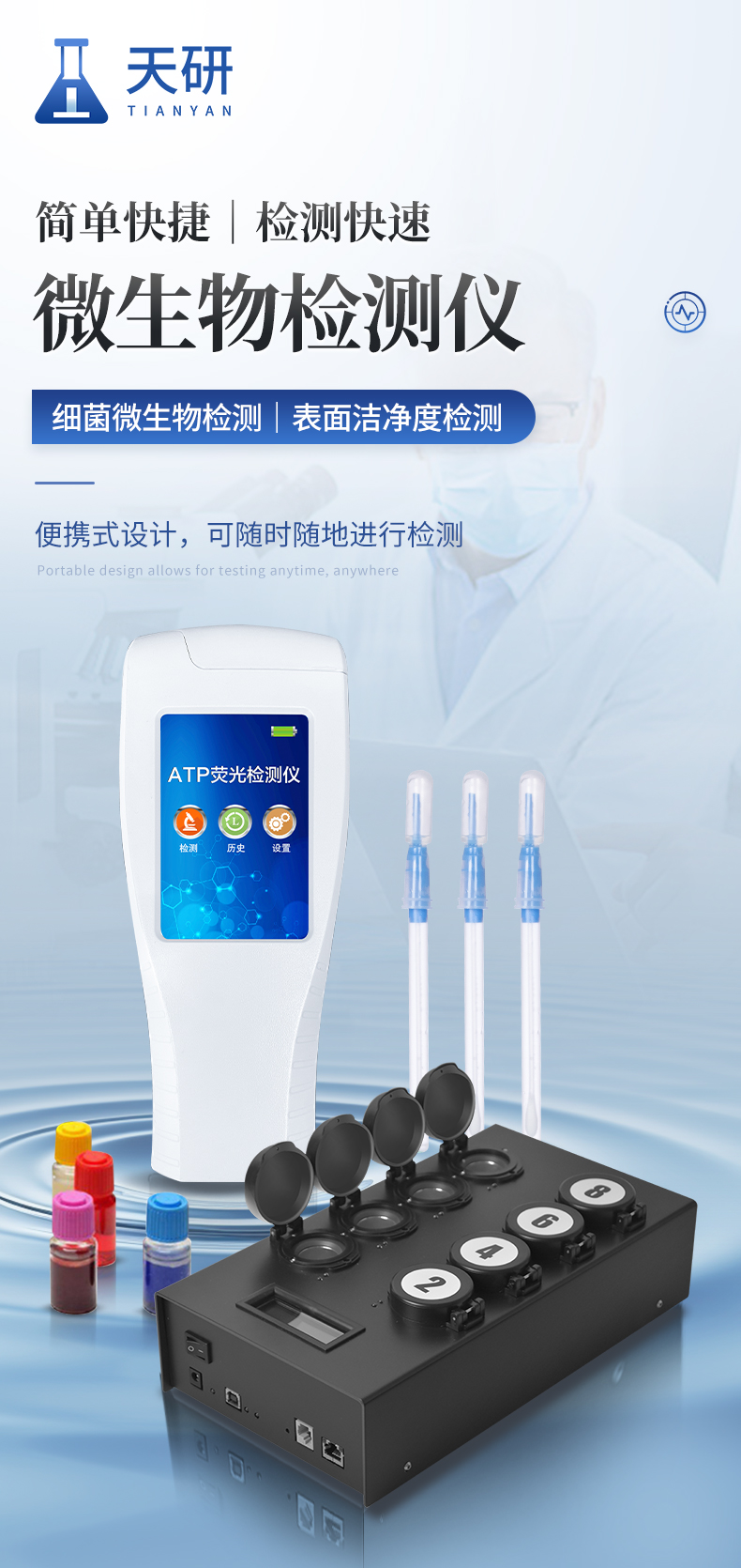 該設(shè)備為全新升級(jí)產(chǎn)品,大屏幕觸摸顯示屏,代替?zhèn)鹘y(tǒng)按鍵。操作采用生物化學(xué)反應(yīng)方法檢測ATP含量,ATP熒光檢測儀基于螢火蟲發(fā)光原理,利用“熒光素酶—熒光素體系”快速檢測三磷酸腺苷(ATP)。ATP拭子含有可以裂解細(xì)胞膜的試劑,能將細(xì)胞內(nèi)ATP釋放出來,與試劑中含有的特異性酶發(fā)生反應(yīng),產(chǎn)生光,再用熒光照度計(jì)檢測發(fā)光值,微生物的數(shù)量與發(fā)光值成正比,由于所有生物活細(xì)胞中含有恒量的ATP,所以ATP含量可以清晰地表明樣品中微生物與其他生物殘余的多少,用于判斷衛(wèi)生狀況。