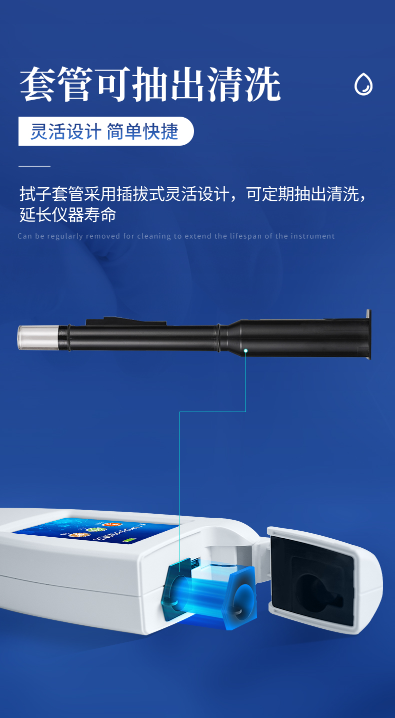 | 實(shí)用性 —— 可根據(jù)環(huán)境檢測需求設(shè)定上下限值,做到數(shù)據(jù)快速評(píng)估預(yù)警,表面潔凈度快速篩查。 | 速度快 —— 常規(guī)培養(yǎng)法18-24h以上,而ATP只需要十幾秒鐘 . | 可行性 —— 微生物數(shù)量與微生物體內(nèi)所含ATP有明確的相關(guān)性。 通過檢測ATP含量,可間接得出反應(yīng)中微生物數(shù)量 | 可操作性 —— 傳統(tǒng)培養(yǎng)方法需要在實(shí)驗(yàn)室由經(jīng)過培訓(xùn)的技術(shù)人員進(jìn)行操作;而ATP快速潔凈度檢測操作非常簡便,只需簡單的培訓(xùn)即可由一般工作人員進(jìn)行現(xiàn)場操作。 | 體驗(yàn)更好 —— 試子套管采用插拔式靈活設(shè)計(jì),可定期清洗長期使用,延長儀器壽命。 |